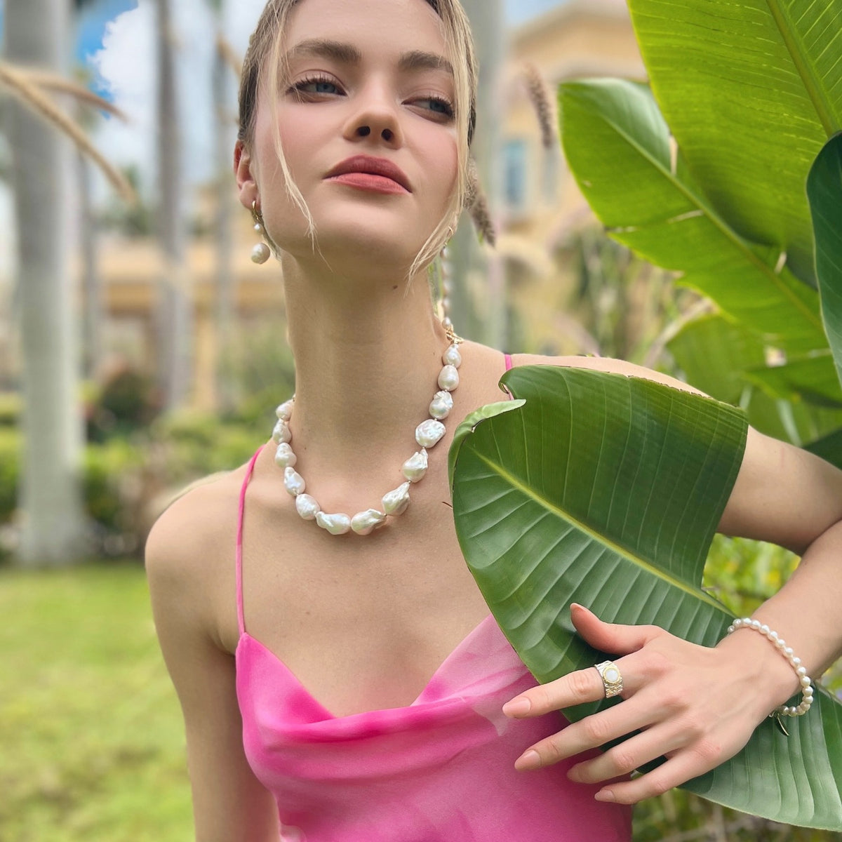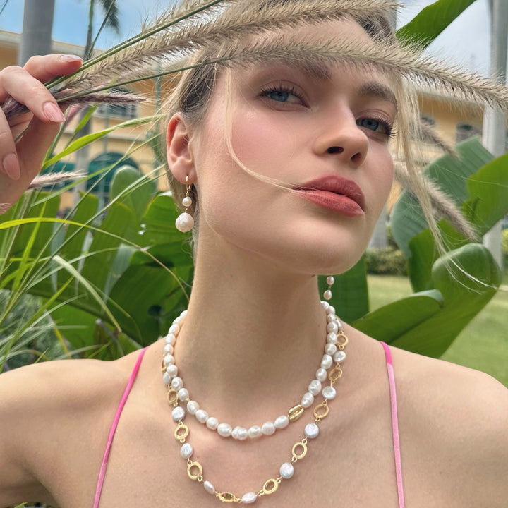 These earrings feature cultured baroque pearls sourced from a pristine lake, making each pair a one-of-a-kind treasure. The pearls' organic shapes and natural hues showcase their unique journey and highlight the wonders of nature. No two pearls are alike, ensuring that your earrings are truly exceptional and exclusive to you. The captivating dangle style of the earrings adds movement and allure to your look. The asymmetrical arrangement of the baroque pearls creates a dynamic and visually striking effect, drawing attention to your face and accentuating your individuality.
