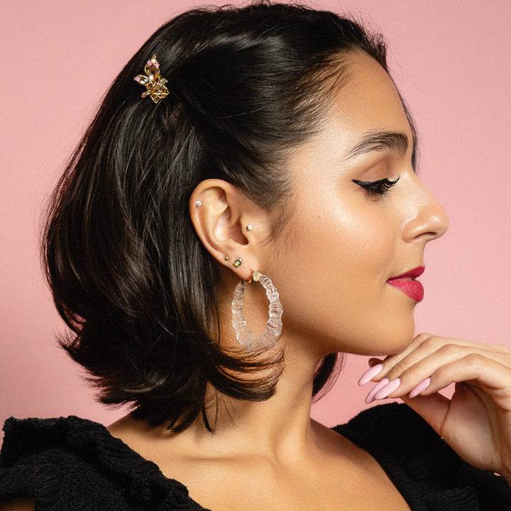 A classic New York Hoop with a modern twist. Our handmade bamboo hoops look like crystal in the light and are a statement hoop! These hoop earrings are handmade lucite with 14K gold plated sterling silver.