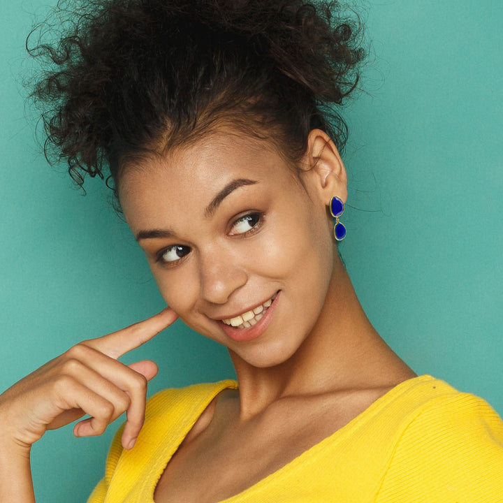 The 'Blue Cat's Eye Drop Earrings Set in Gold-Plated Brass' are a must-have for those who have an affinity for the mesmerizing shades of blue. These earrings are not only a fashion accessory but also a beautiful expression of your love for this calming and versatile color. Each earring showcases a captivating blue cat's eye gemstone, which is known for its enchanting play of light and color. The cat's eye effect adds depth and intrigue to the rich blue hue, creating a dynamic and ever-changing appearance that's sure to catch the eye. Avoid contact with water and cosmetics, such as creams or perfumes. Clean with a clean dry cloth.