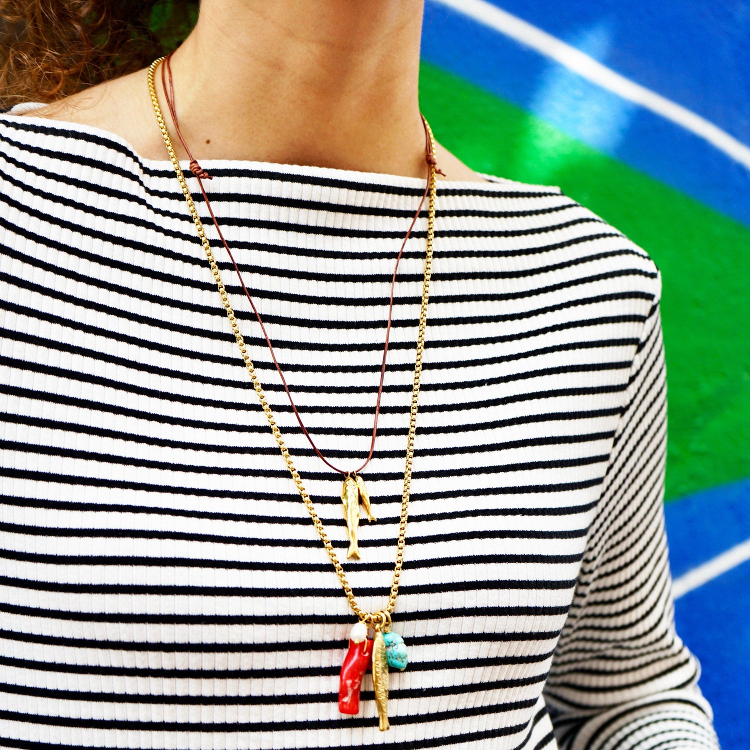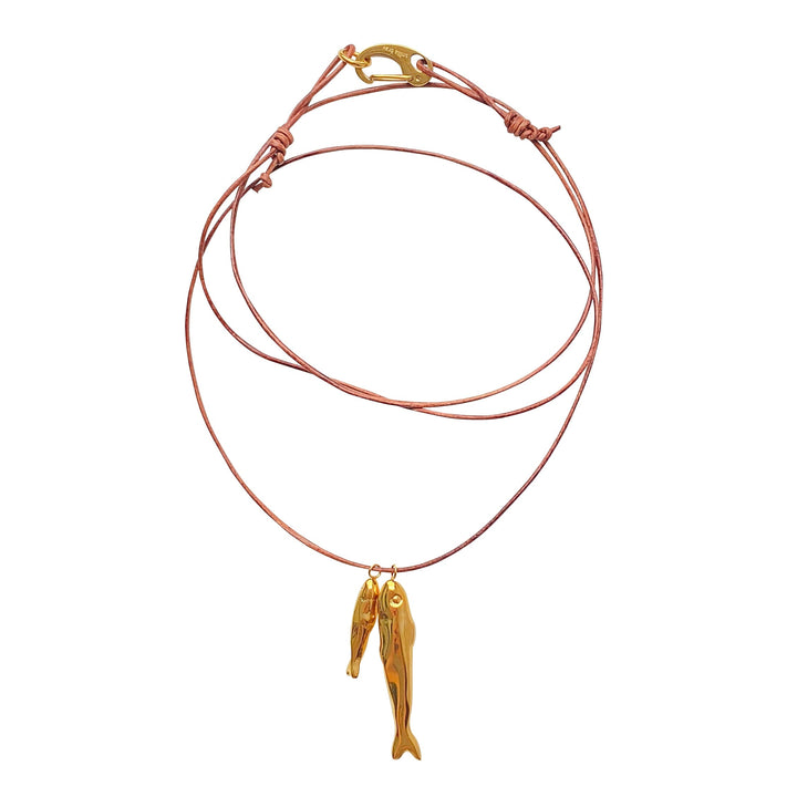 Materials: This handcrafted necklace features golden fish pendants on a soft brown leather cord. It is adjustable in size. To maintain its quality, avoid contact with saltwater, harsh chemicals, and extreme temperatures.