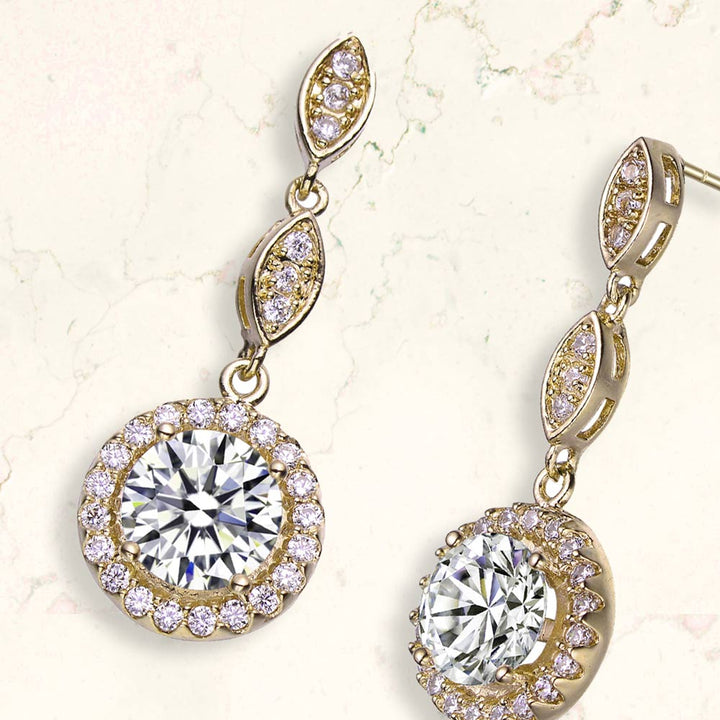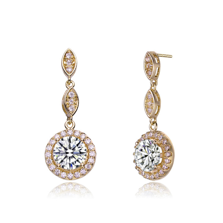 These round drop earrings feature dazzling white round-cut cubic zirconia stones. Crafted of .925 sterling silver, with gold plating, the earrings secure with butterfly clasps. Add up to your collection Now!