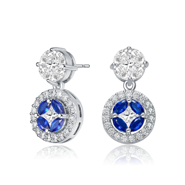 Sterling Silver White Gold Plated. A gorgeous and stunning combination of Sapphire blue marquise Cubic Zirconia and clear princess Cubic Zirconia with a dazzling halo of clear round Cubic Zirconia inset in Sterling silver with White Gold Plated will definitely add a pop of pretty color to your look. These earrings are secured with butterfly clasp.