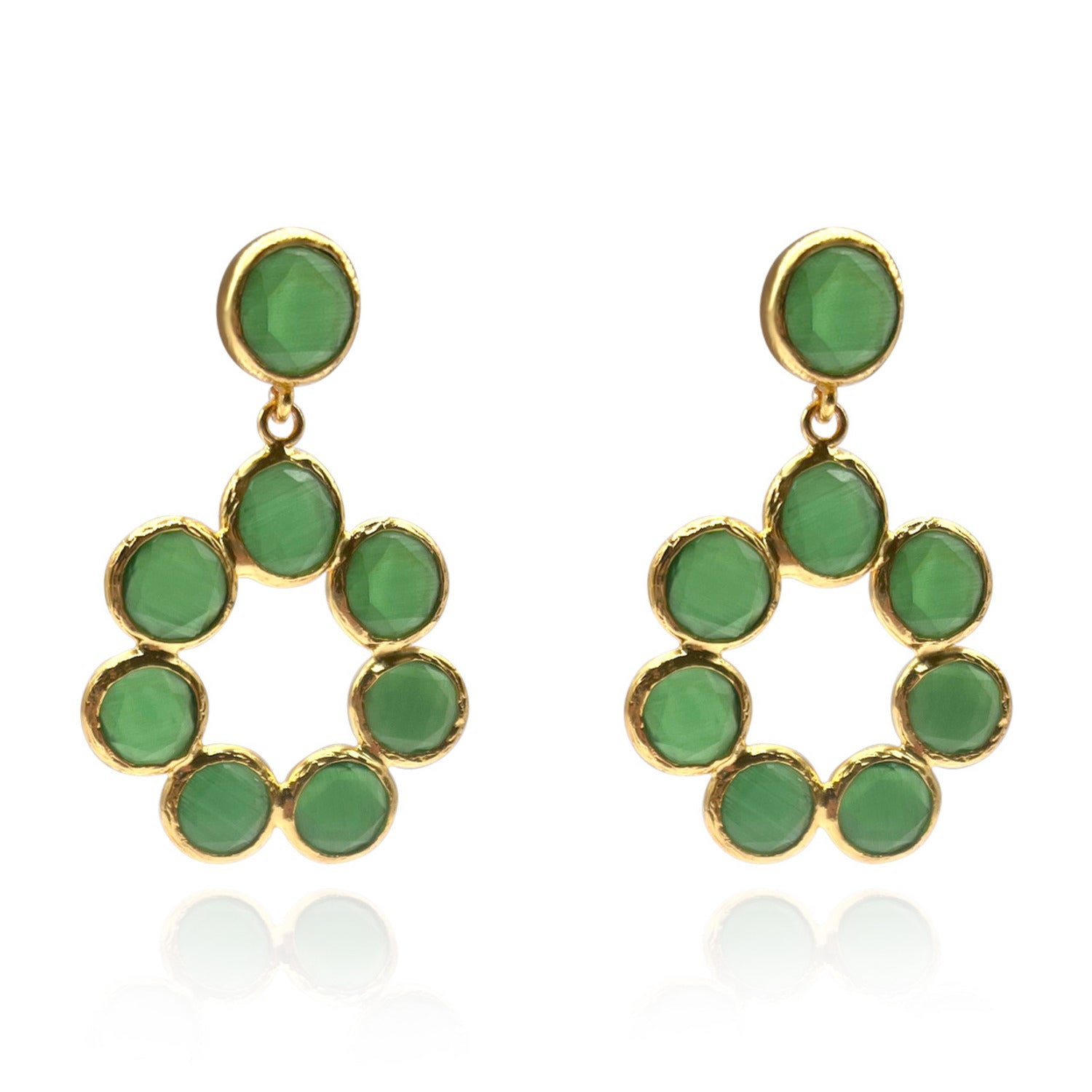 The 'Green Catseye Earrings Set in Round Gold-Plated Brass' are a remarkable jewelry choice for those who are drawn to the lush and captivating shades of emerald green. These earrings are not just an accessory; they are a bold statement piece that embodies the beauty of greens and blues. Each earring features a striking emerald green cat's eye gemstone, set in a round frame of gold-plated brass. The rich green hue of the cat's eye is mesmerizing, and the cat's eye effect adds depth and dimension to the stone, creating a dynamic interplay of light and color. The choice of gold-plated brass as the setting adds a touch of luxury and sophistication to the design. Avoid contact with water and cosmetics, such as creams or perfumes. Clean with a clean dry cloth.