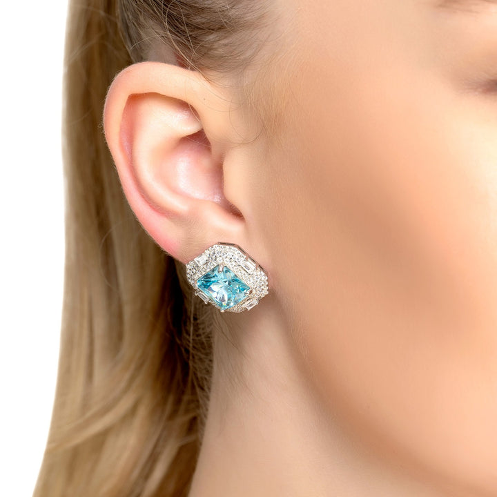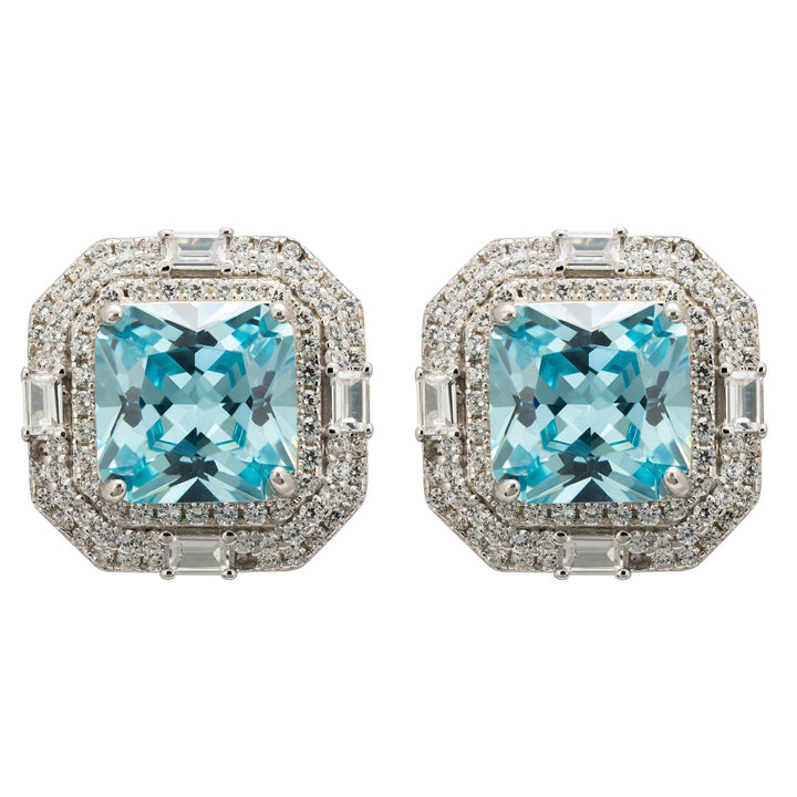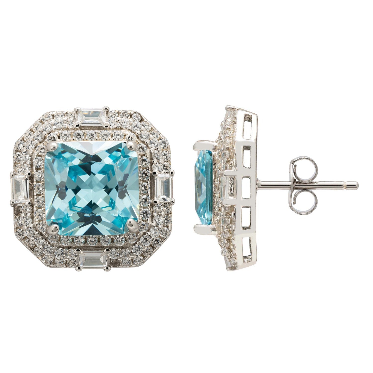 Step out in style with the Madeleine Large Stud Earrings Silver Blue Topaz. The lab-created gemstones are square cut and surrounded by three rows of shimmering simulated diamonds, these handcrafted 925 sterling silver earrings will add an element of elegance and glamour to your look. With its vogue shape, these earrings are sure to be the envy of all your friends! Blue Topaz is a beautiful gemstone that has been used in jewellery for centuries. It is believed to bring luck, love and joy to the wearer, as well as having the power to promote harmony, peace of mind and good fortune. Blue Topaz also symbolizes loyalty and faithfulness. Whether stepping out for a special occasion or dressing up for a casual night on the town, be sure to accessorize with the Madeleine Large Stud Earrings.