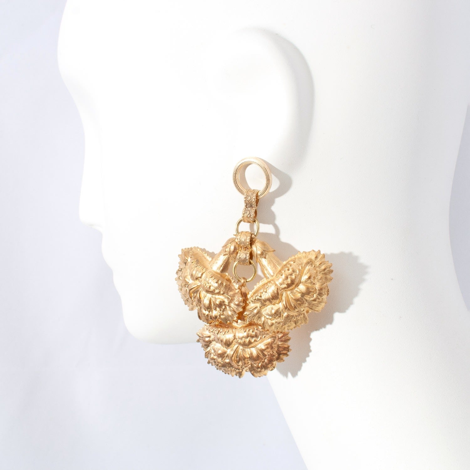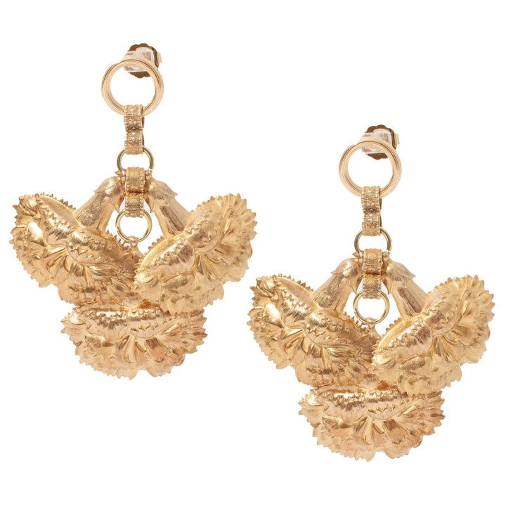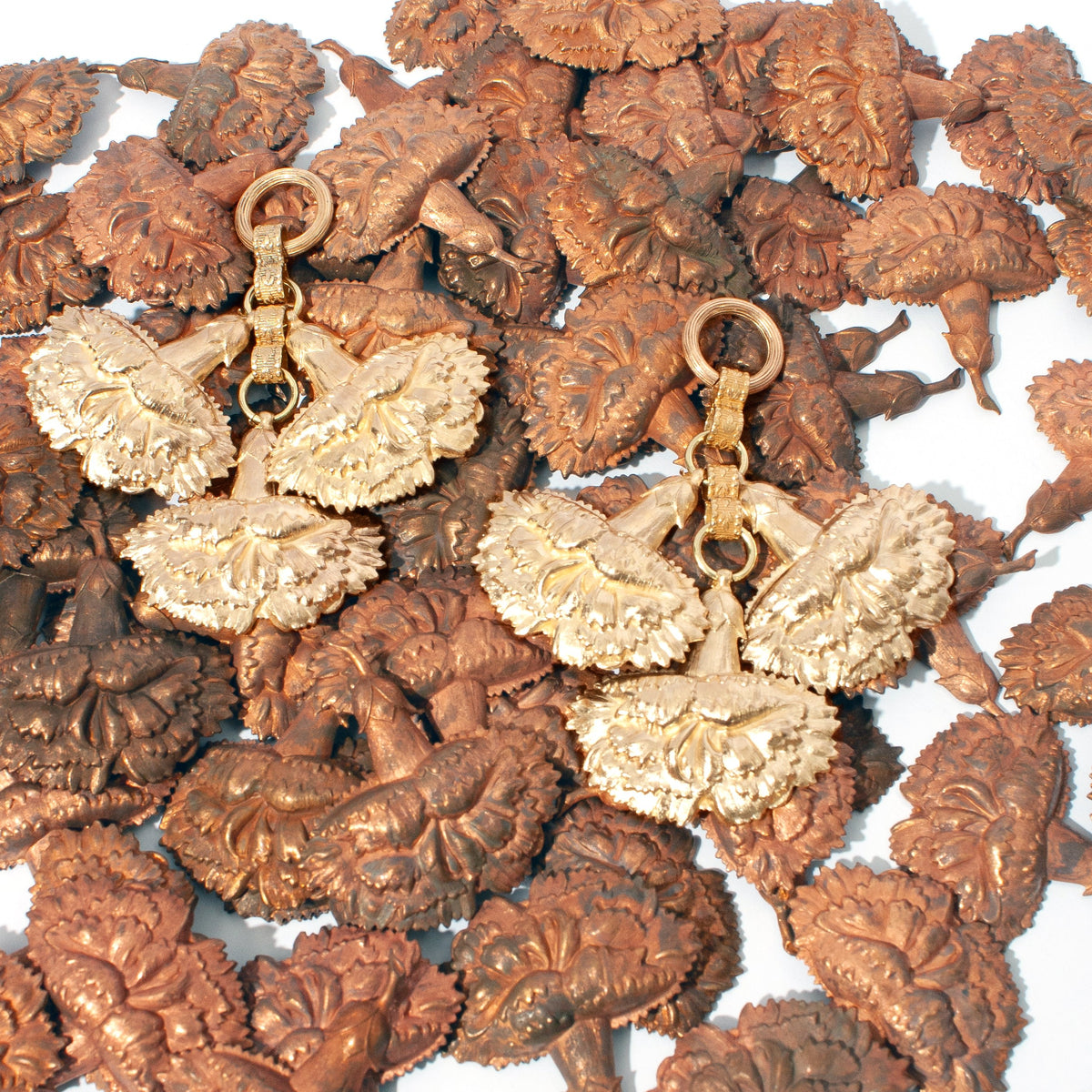 These Carnation Earrings by Castlecliff are a unique and artistic piece from the Reclaimed Vintage Series. They are composed of 100% upcycled materials, including large, vintage carnation stampings from the Miriam Haskell estate dating back to the 1940s. The three detailed carnation stampings are suspended from recycled brass links, creating a bold, eye-catching design. Handcrafted in NYC, each piece is unique and celebrates the charm of upcycled materials, offering a rich patina that develops with wear.