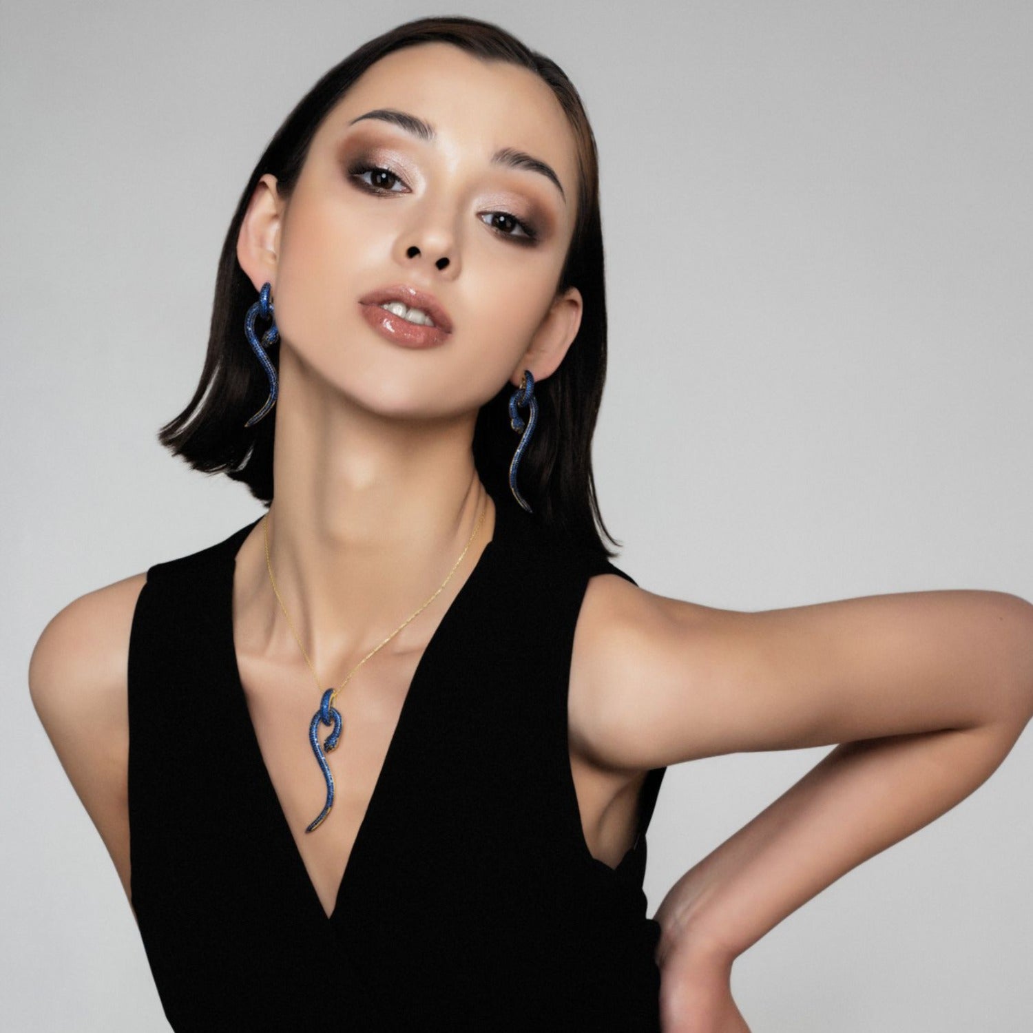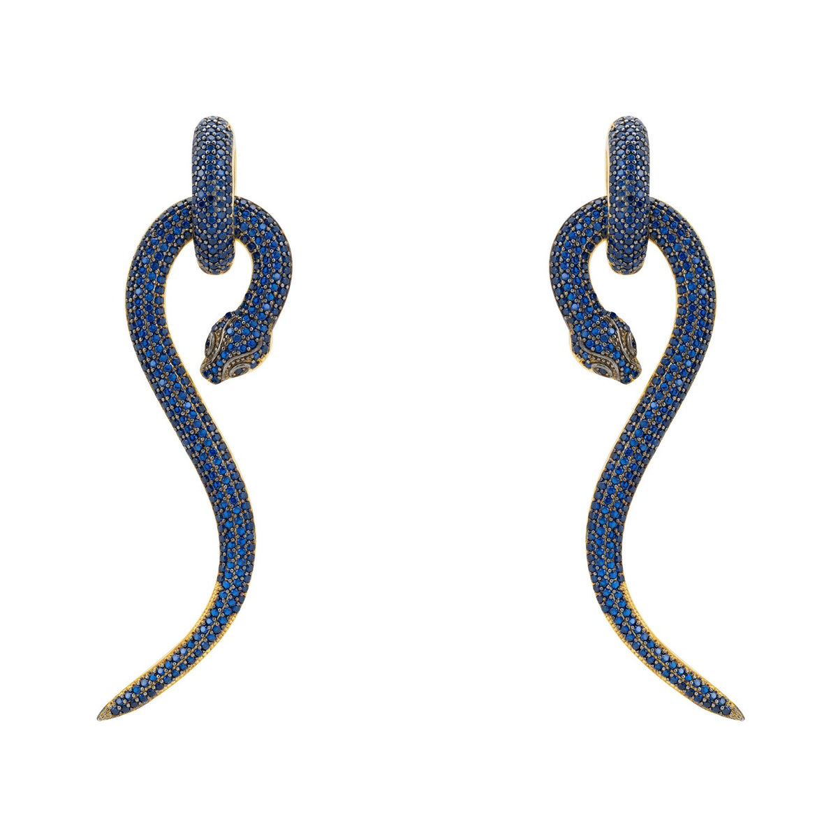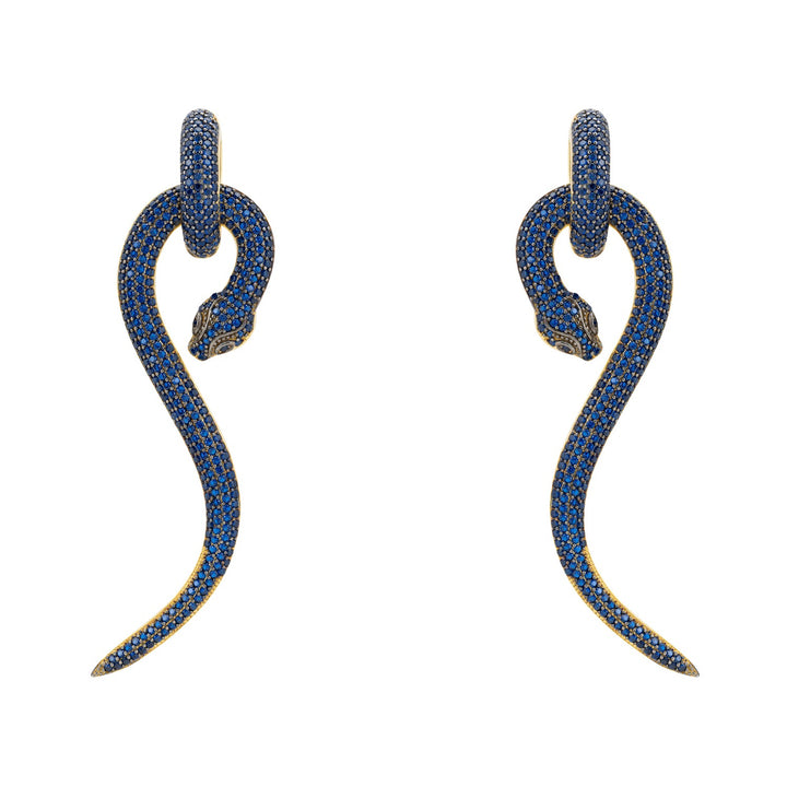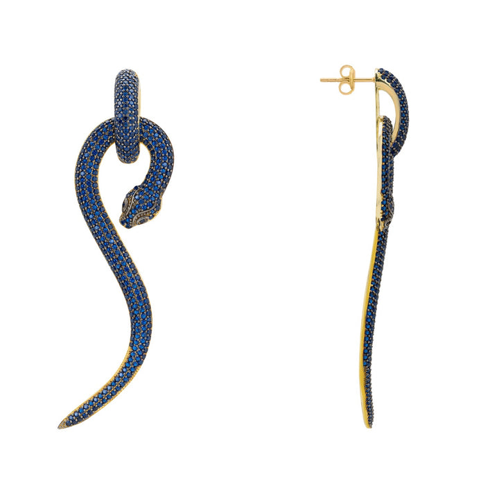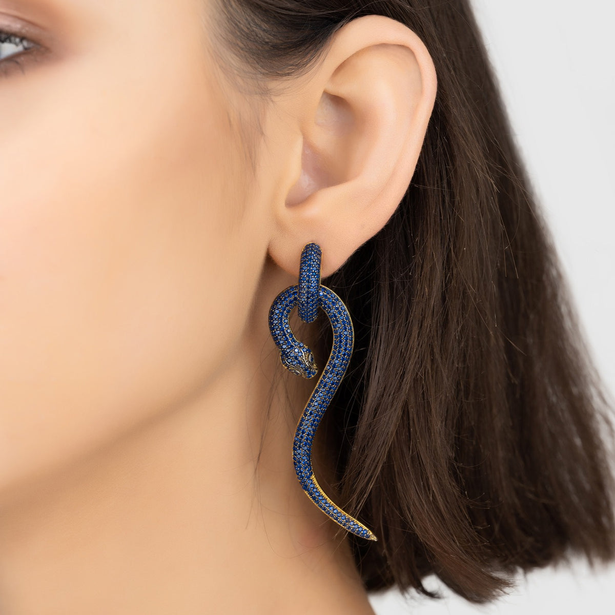 Let the Anaconda snake drop earrings be your new wardrobe staple. Ideal for those who love animal inspired jewellery that can be worn for a chic daytime look through to evening elegance. These earrings make a bold statement, enhanced with sparkling cubic zirconia. Historically, serpents and snakes represent fertility or a creative life force. Snakes have been linked to magic in every spiritual tradition. Regularly renewing their skins, they are a symbol of transformation and rebirth. Made of sterling silver, with stud post fastening, these earrings are light and comfortable to wear.