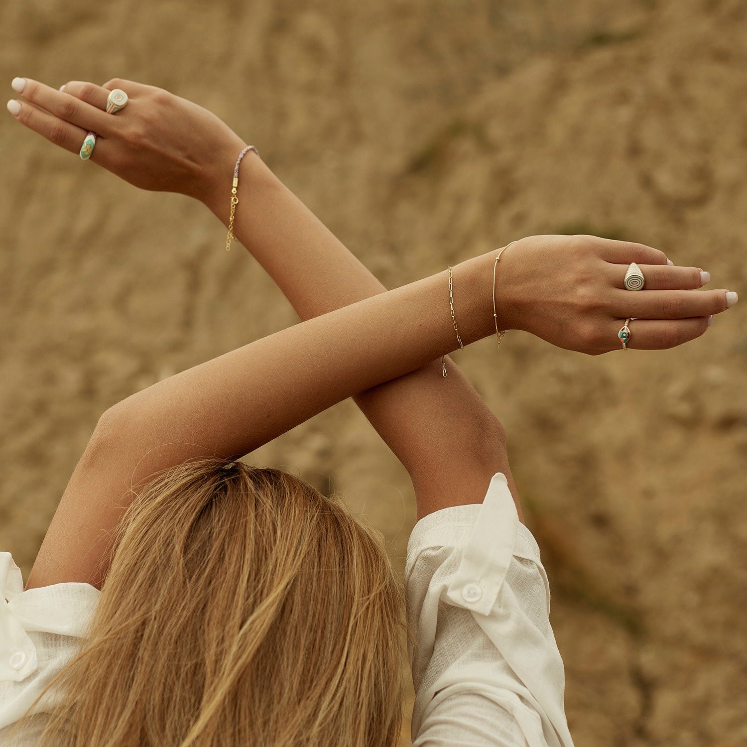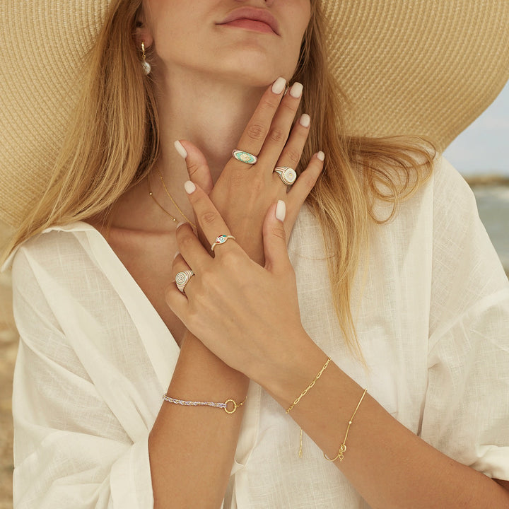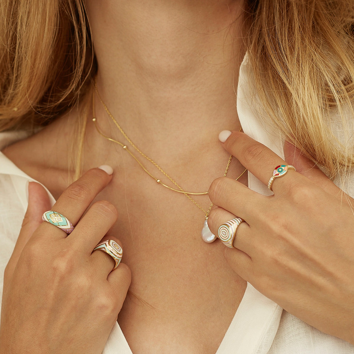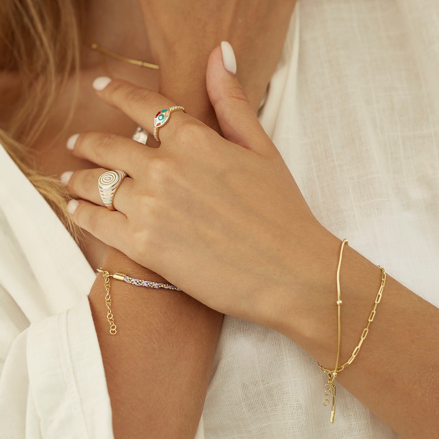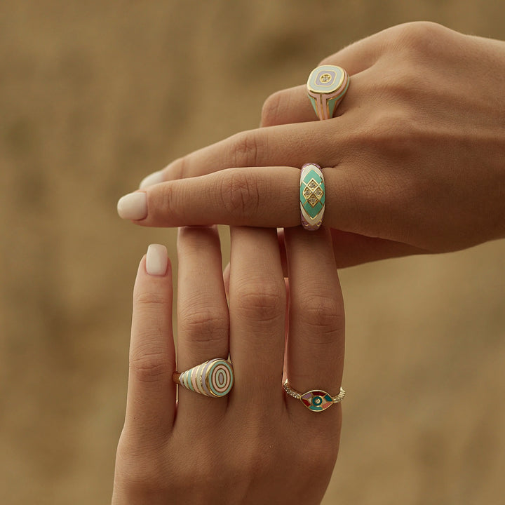 The Multi Pastel Enamel Signet Ring by Spero London is playful yet elegant. Its round geometric design, filled with pastel hues, adds a whimsical charm while maintaining a luxurious gold tone. Adjustable for perfect fit, it’s ideal for stacking or wearing solo as a joyful pop of color.