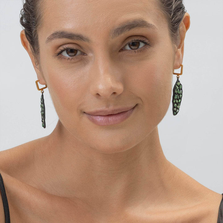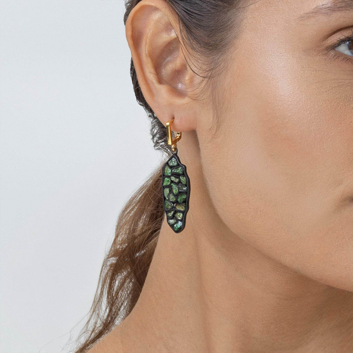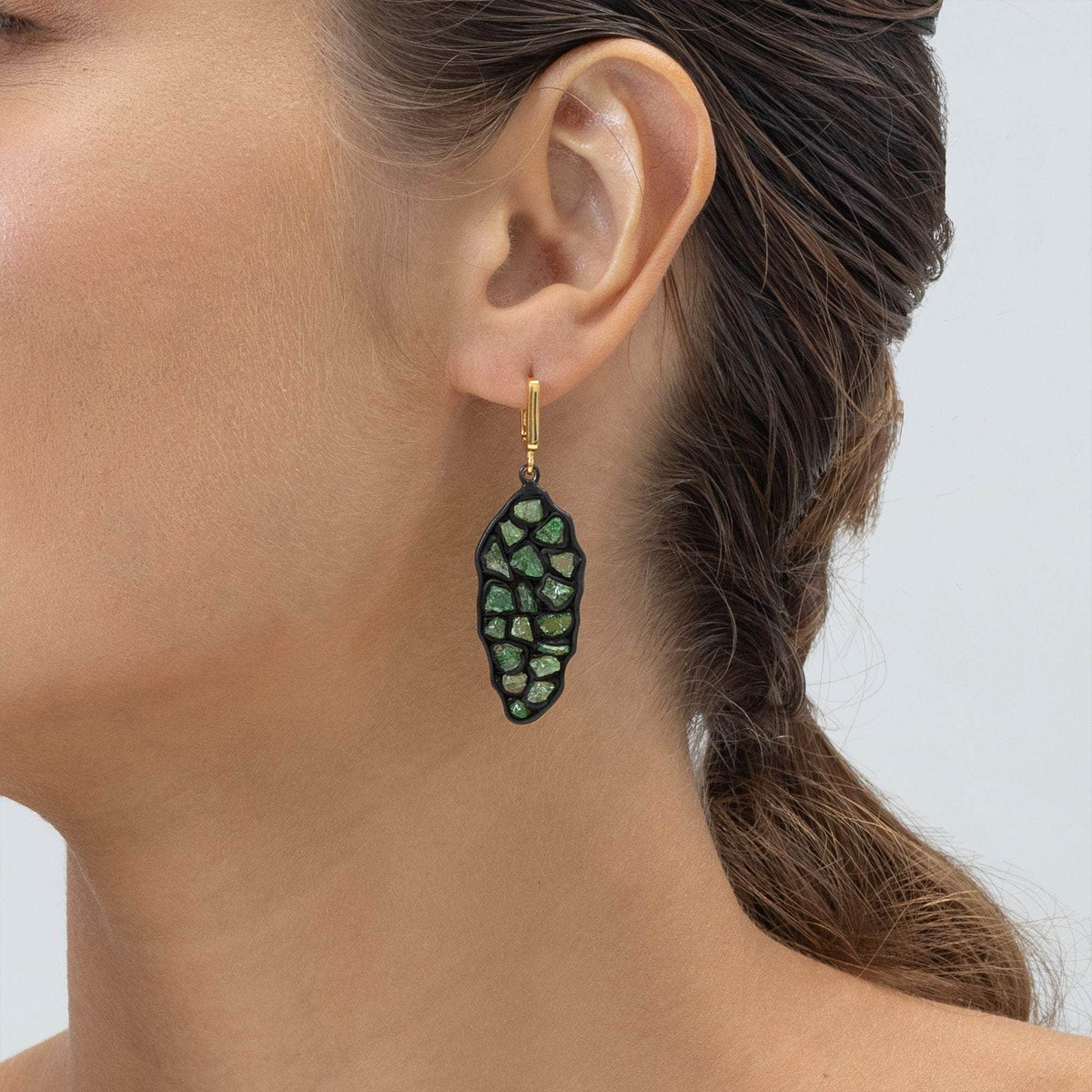 This pair of designer earrings showcases German Kabirski's hallmark Stained Glass technique, where natural, irregularly shaped gemstones are connected by silver wrappings to create a colorful kaleidoscope effect. Crafted from 925 Silver and plated with 18K Gold and Black Anthracite, these slightly asymmetric earrings offer a dark, contrasting aesthetic along with comfortable, allergy-free wear. Featuring natural raw Tsavorite garnet crystals in their pure, untreated state, these earrings connect wearers to the wild, untamed forces of nature. Please Note: This piece is handmade, and your item may slightly differ from the picture due to the irregular shapes of raw gemstones.
