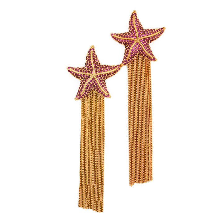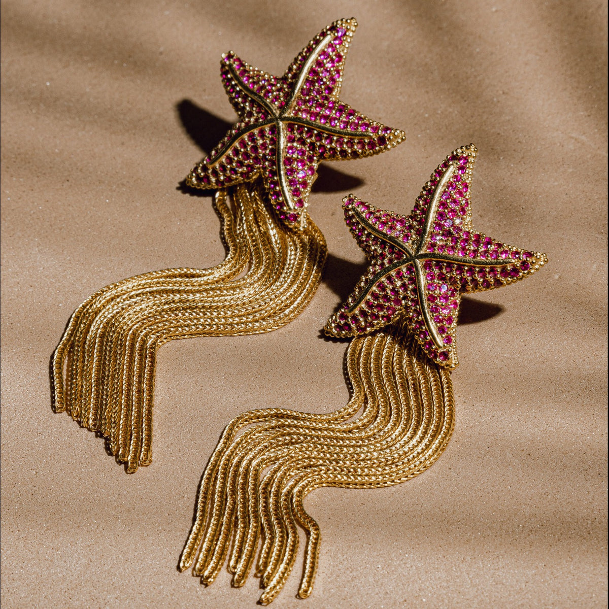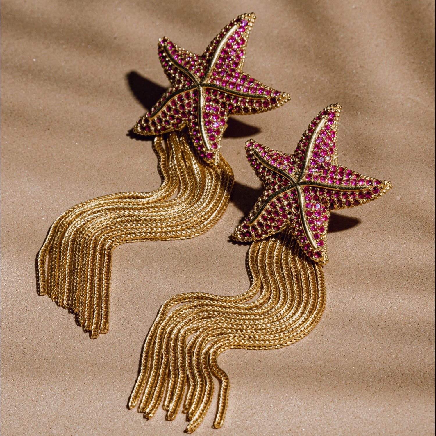 Gold plated star shaped dangling earrings, post finish; pink rhinestones. These call for a basic outfit because they will be the star of the outfit (pun intended). Fun, trendy and gorgeous looking, these are the earrings for a remarkable night out! Please avoid any contact with perfumes and cosmetics