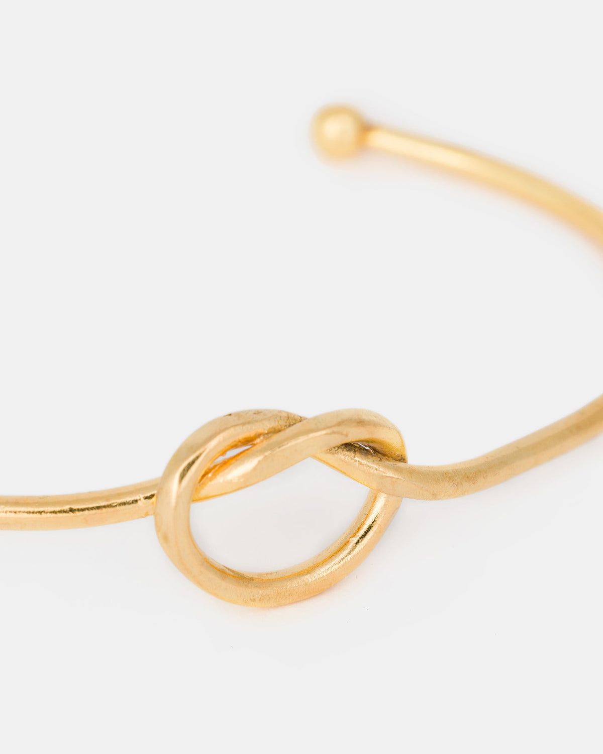 This bangle is handcrafted from a gold-plated material and features a knot design. The specific base metal is not listed.
