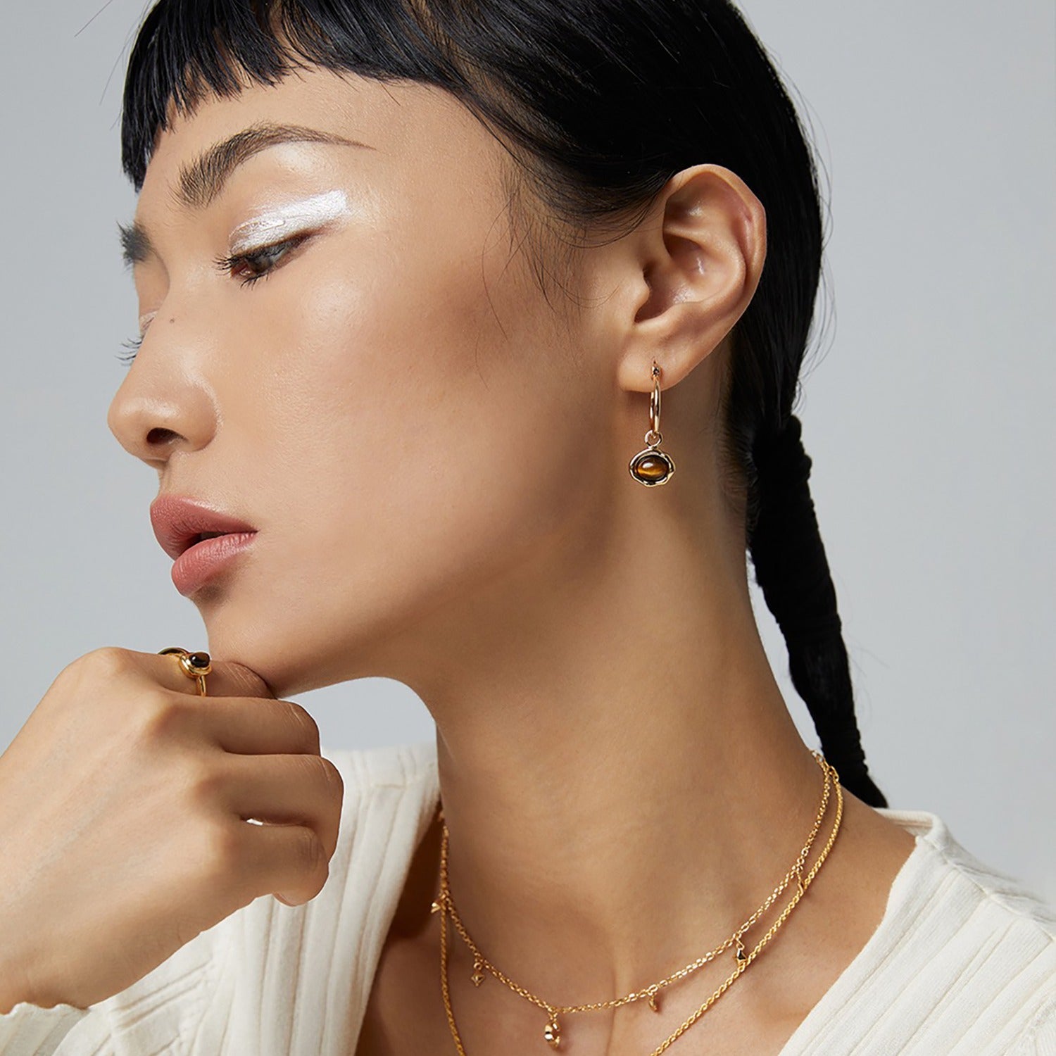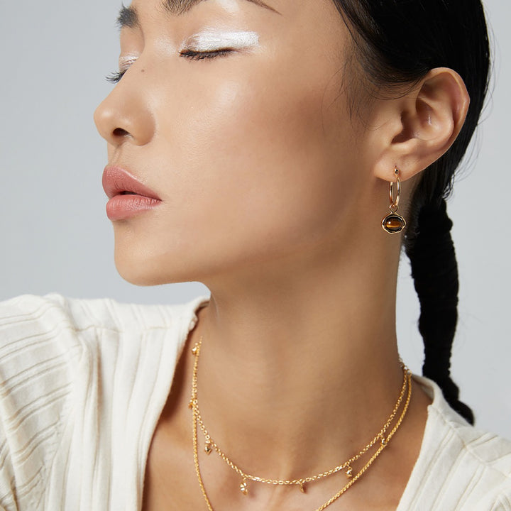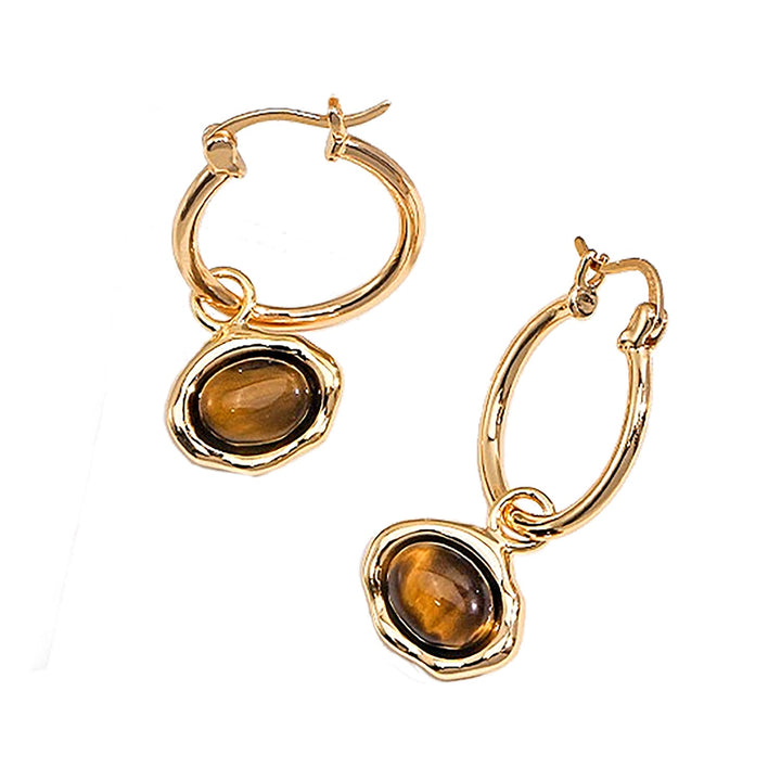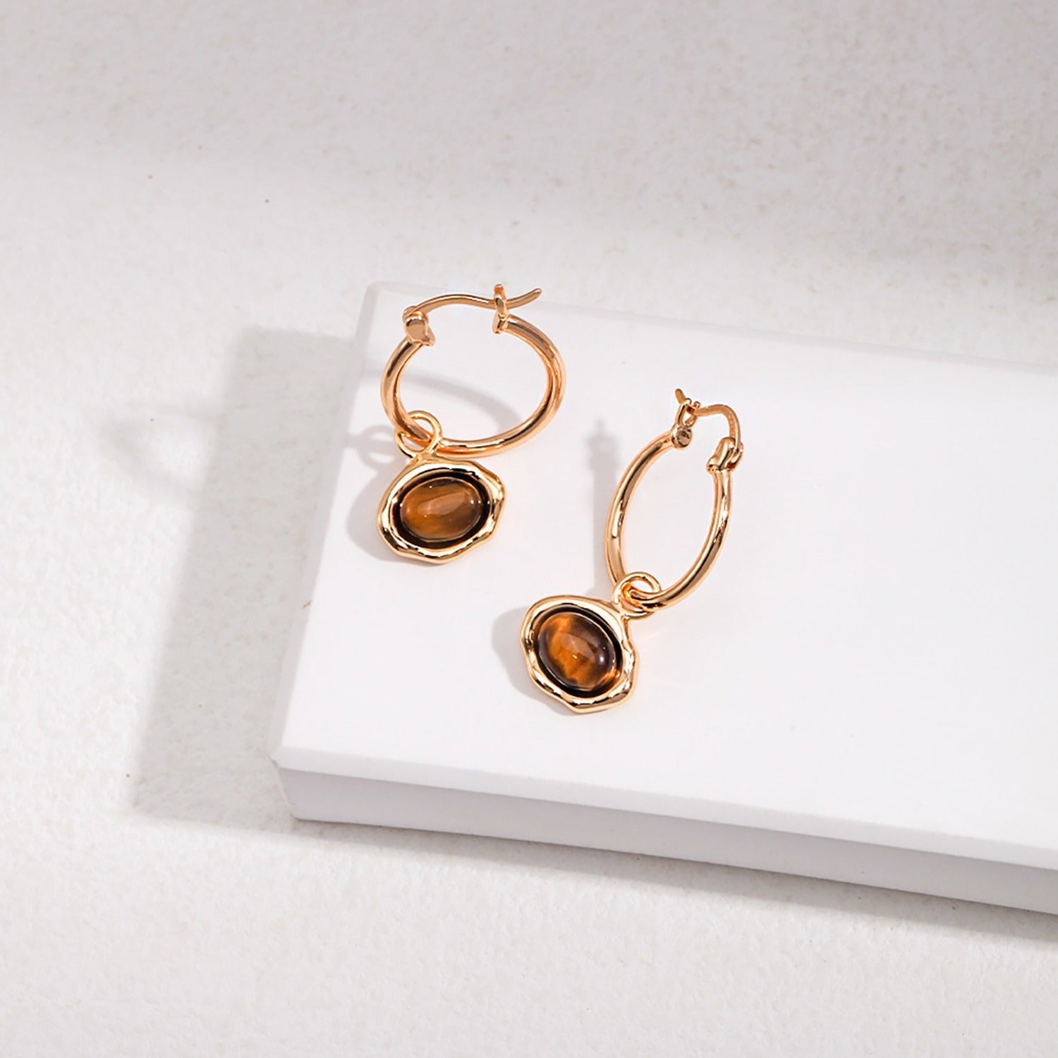 Elevate your everyday style with these minimalist brown tiger eye stone hoop earrings. Crafted with genuine tiger eye gemstones set in a sleek, golden metal hoop, these earrings offer a timeless, versatile look perfect for any occasion. The slender, golden-toned metal hoops provide a simple, elegant frame, allowing the tiger eye stones to truly shine. The minimalist design offers a refined, understated look that suits a variety of personal styles and can be easily dressed up or down.
