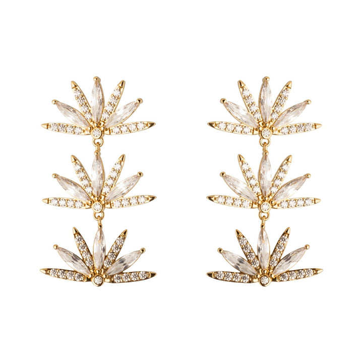 These earrings are made from gold and crystals. They feature a lightweight, triple-drop design.