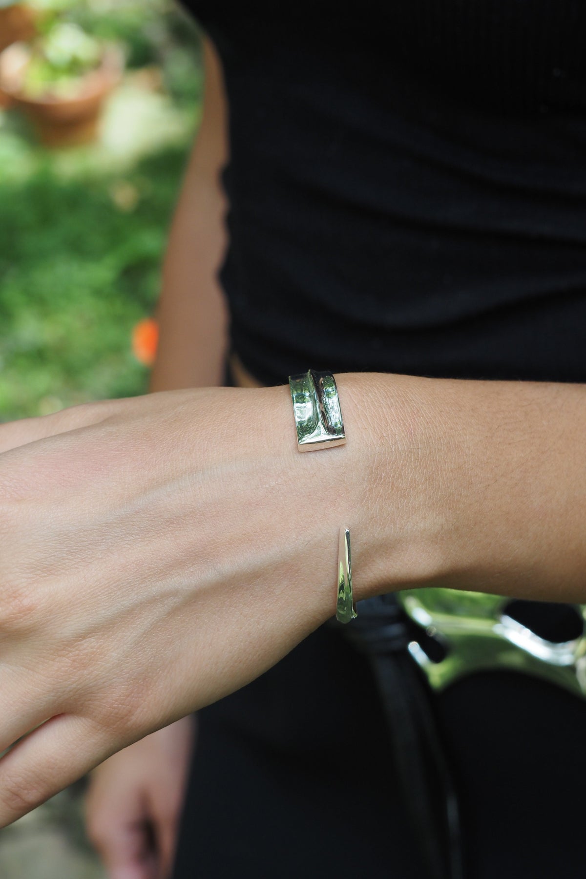 This Open Bangle Bracelet Silver by Nicole Amato blends sculptural artistry with modern elegance. Hand-sculpted edges reflect light for a luminous finish, while its open asymmetrical design allows versatile styling—worn solo or stacked for boho-chic layers.
