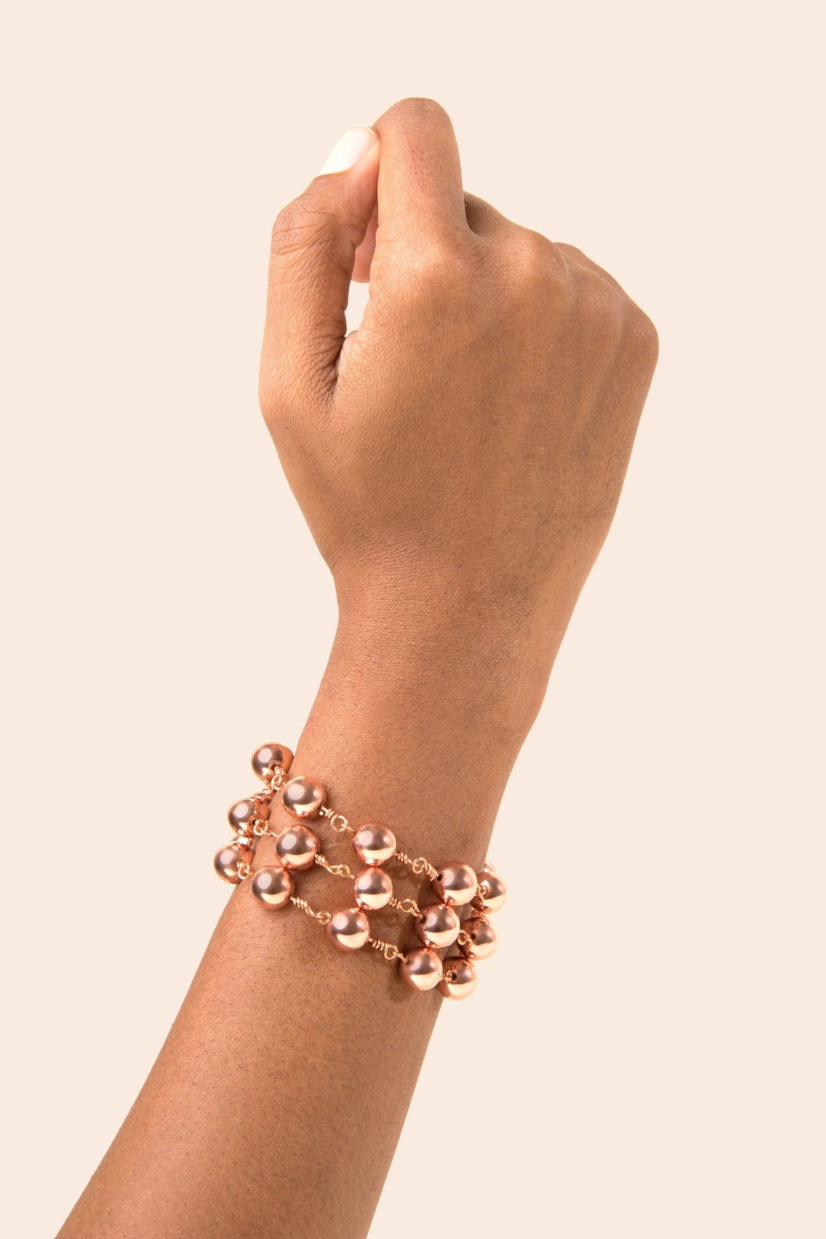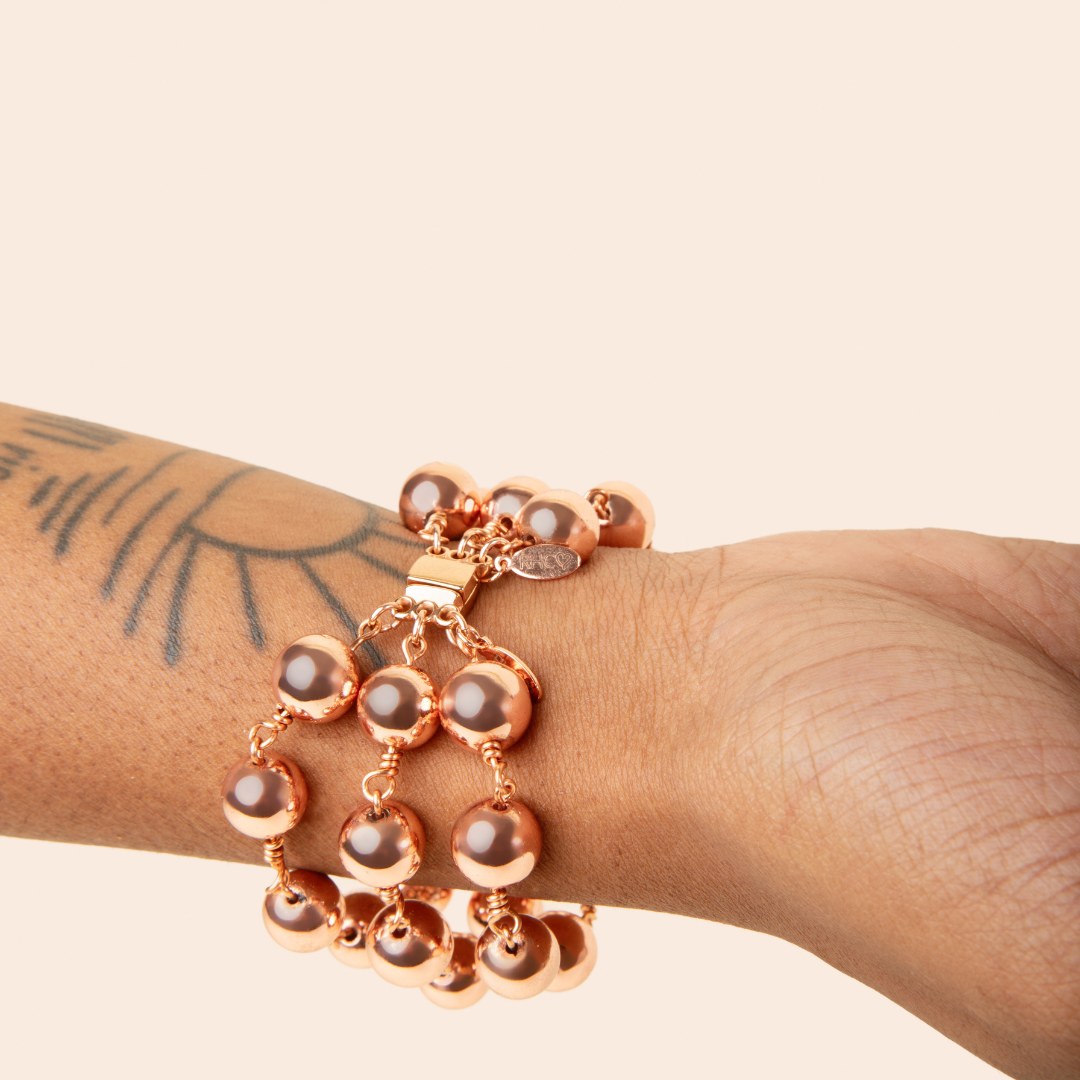 This bracelet is made with three layers of 18k rose gold hematite beads. It has a magnetic clasp.