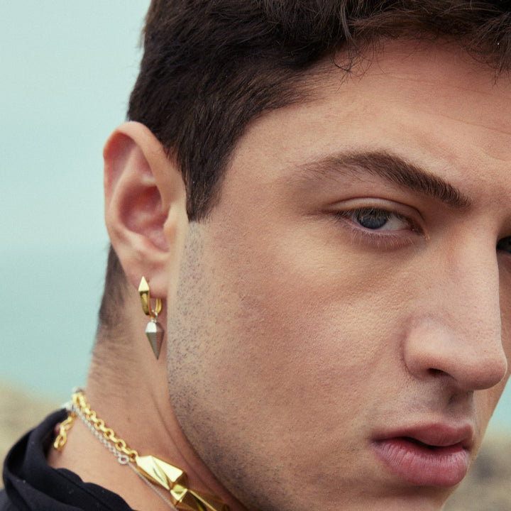 This Urban Wilds Silver Pendant Mono Earring with Gold Hoop by Mishka embodies the heartbeat of the city while staying rooted in nature. The recurring octagonal crystal design—central to the Urban Wilds collection—reminds us that even in the rush of urban life, our wild, natural essence endures. Designed as a unisex piece, it balances bold geometry with modern refinement, offering a distinctive accessory that carries symbolic depth and contemporary edge.