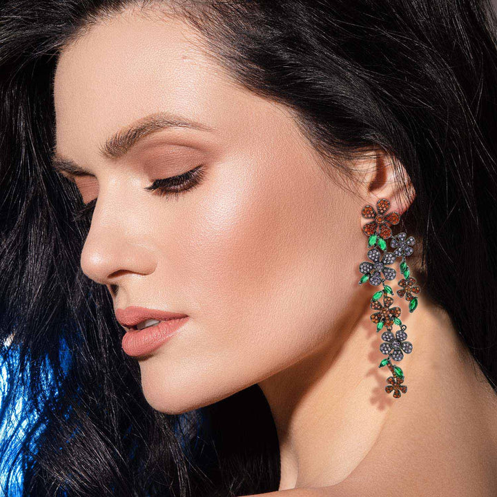 Elevate your style with our enchanting Orange and Amethyst Cubic Zirconium Pave Floral Drop Earrings, accented with touches of Emerald Navette Cubic Zirconiums—a delightful choice for those who adore whimsical accessories. Crafted with care, these earrings feature vibrant orange and amethyst cubic zirconium pave stones arranged in a charming floral design. The addition of emerald navette cubic zirconiums adds a playful touch, creating a fun and flirty look. Perfect for lovers of whimsy, these earrings are the ideal accessory for adding a pop of color and personality to your ensemble. Whether you're attending a special event or simply want to elevate your everyday attire, these earrings are sure to make a statement with their unique charm.