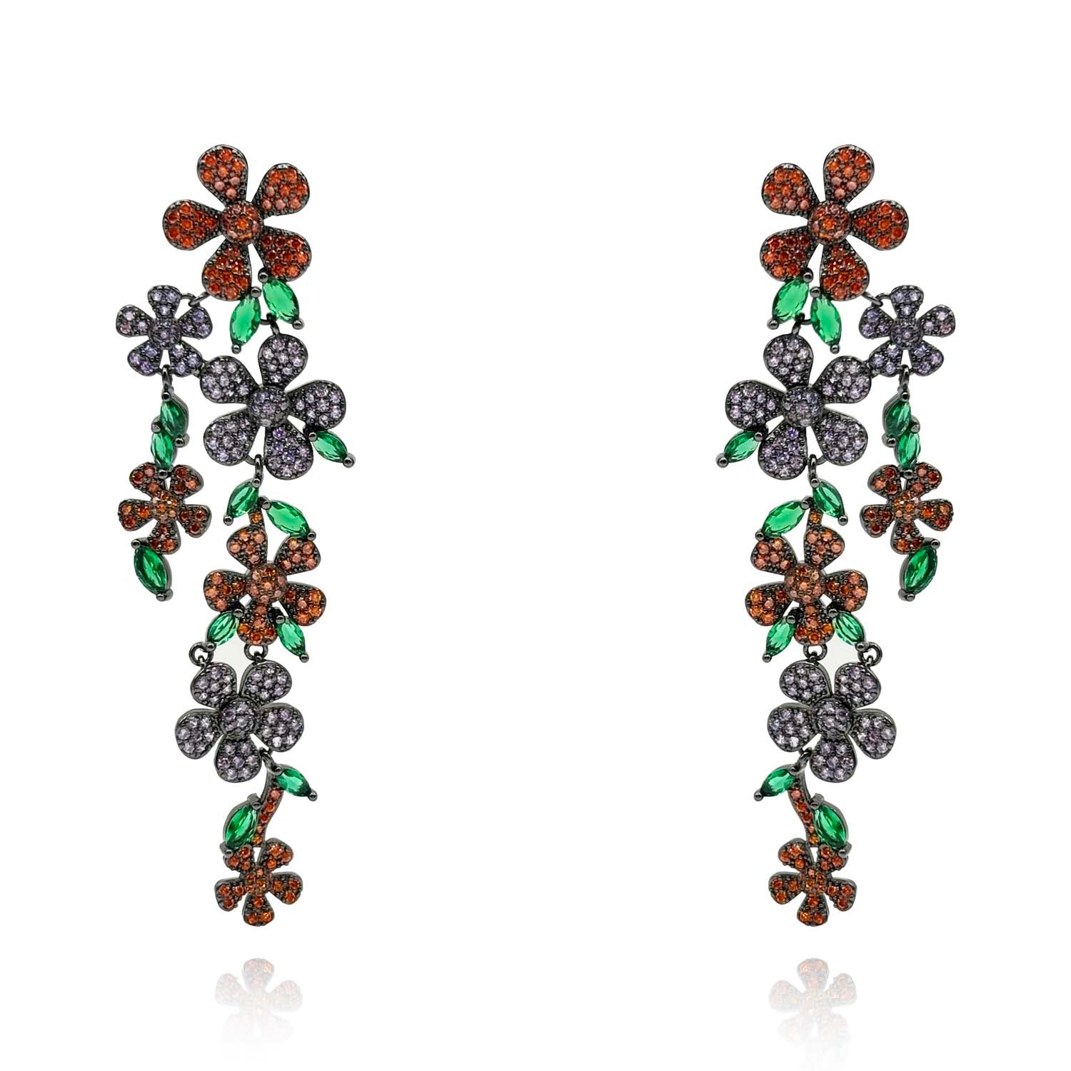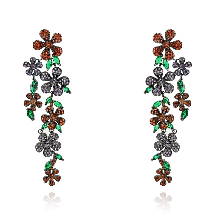 Orange And Amethyst Cubic Zirconium Pave Floral Earrings With Emerald Navettes