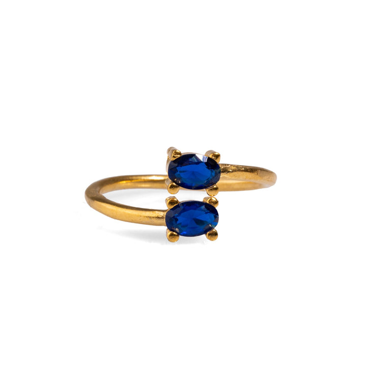 This adjustable ring is crafted from high-quality brass and plated with 24k gold. It features two sapphire stones.