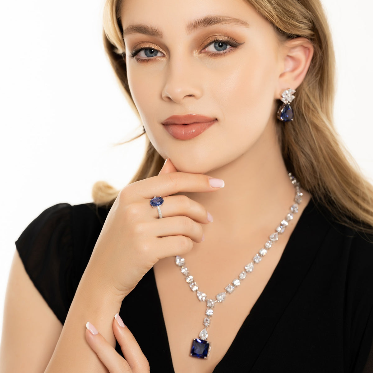925 Sterling Silver. Lab Created Tanzanite Gemstone. Cubic Zirconia. Simulated Diamonds.