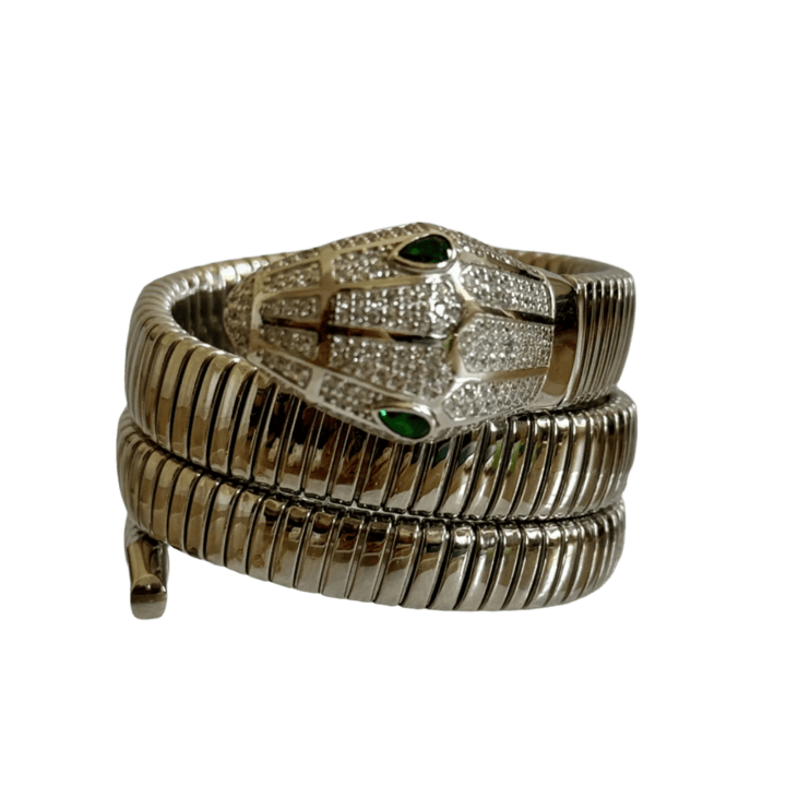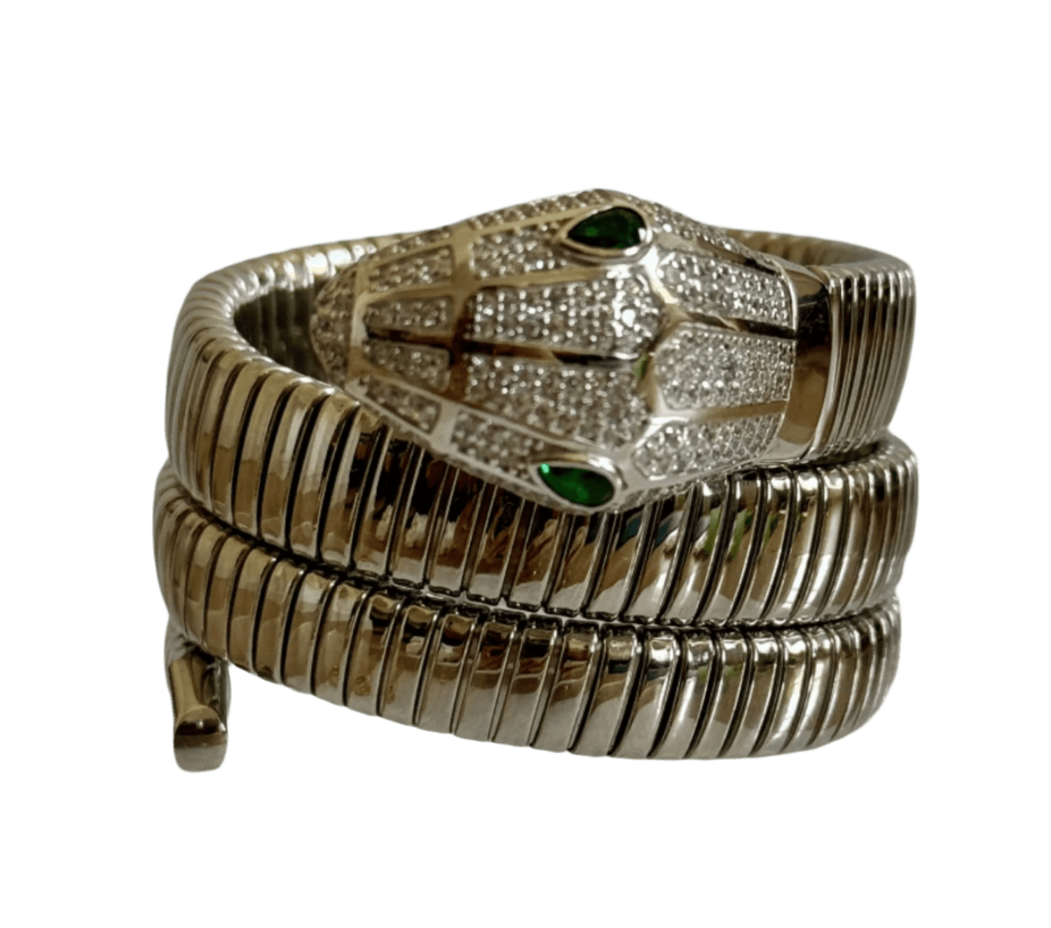 This bracelet is made of sterling silver and features green crystal eyes and a pavé head. It best fits an XS wrist up to 6 inches.