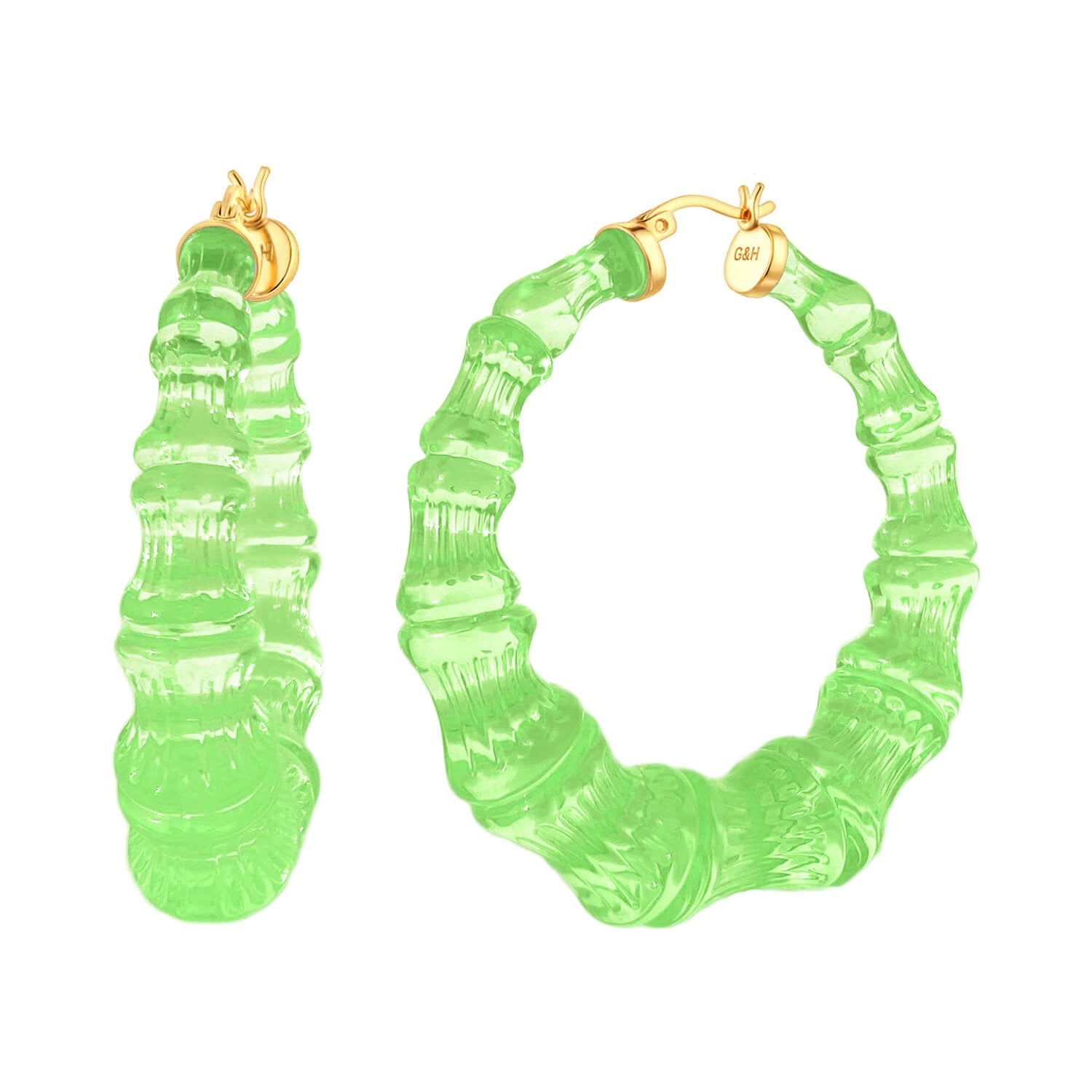 Our bamboo hoops are a Queens must-have. These are a classic 90s hoop, but with a twist! These are one of our best selling items. The glass like lucite makes these hoops shine and will have everyone saying 'OMG! I LOVE YOUR HOOPS!! I NEED THOSE TOO!' These translucent Lime Green Hoop Earrings are handmade lucite with 14K gold plated sterling silver