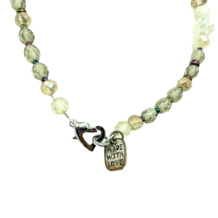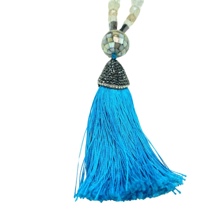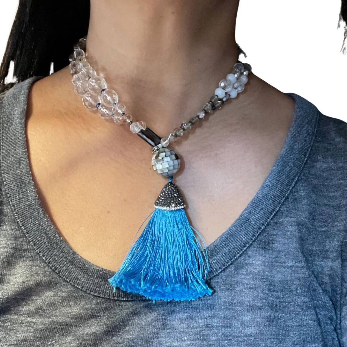 This necklace features faceted quartz crystals and vintage Czechoslovakian glass beads. It has a blue silk tassel, a mother-of-pearl bead, and a heart-shaped clasp. It can be worn long or as a choker.