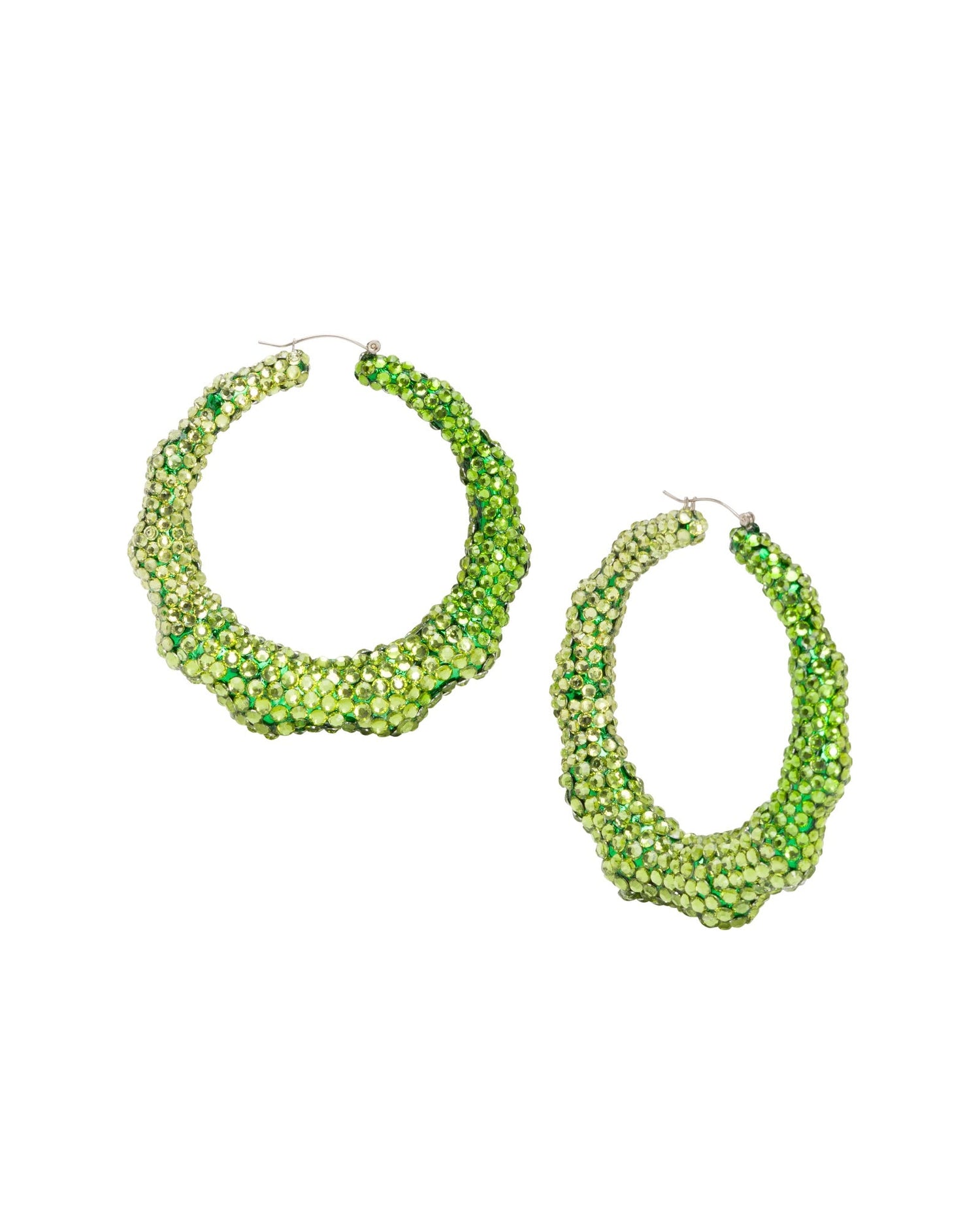 Introducing our limited edition, handcrafted classic 80's style bamboo earrings, designed to be the highlight of any party! Lightweight with a funky urban edge, these hoop earrings feature the iconic 80's bamboo shape, adorned with green crystal rhinestones in a captivating ombre pattern. Set on a gold-plated hoop body, each pair is truly one-of-a-kind, just like you. Produced in small batches, these earrings emphasize the unique handmade charm and individuality. Whether you're glamming up for a girls' night out or adding a touch of sparkle to your casual denim ensemble, these iconic earrings are sure to make a statement!