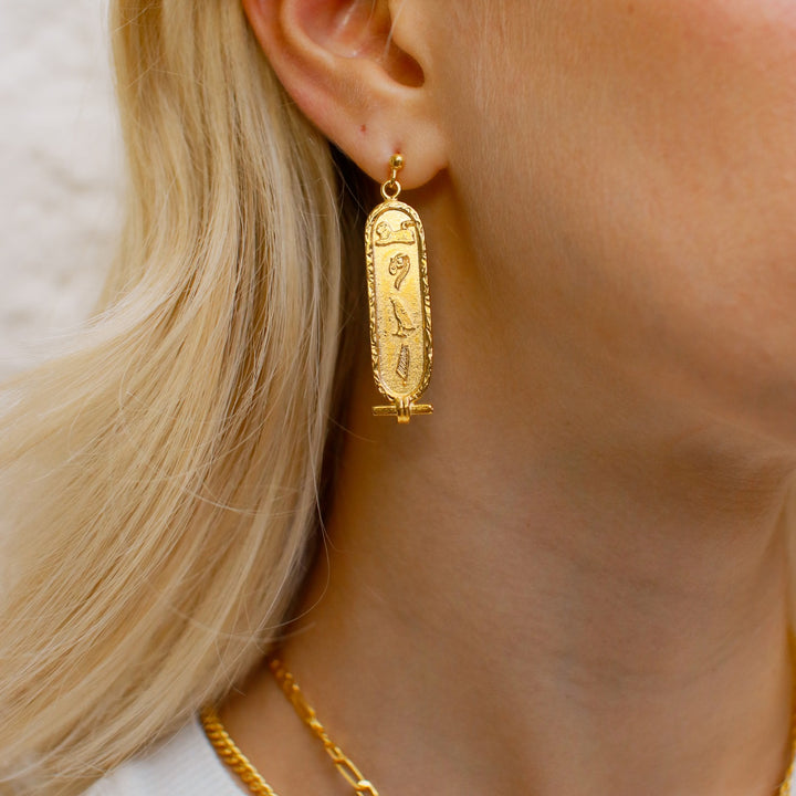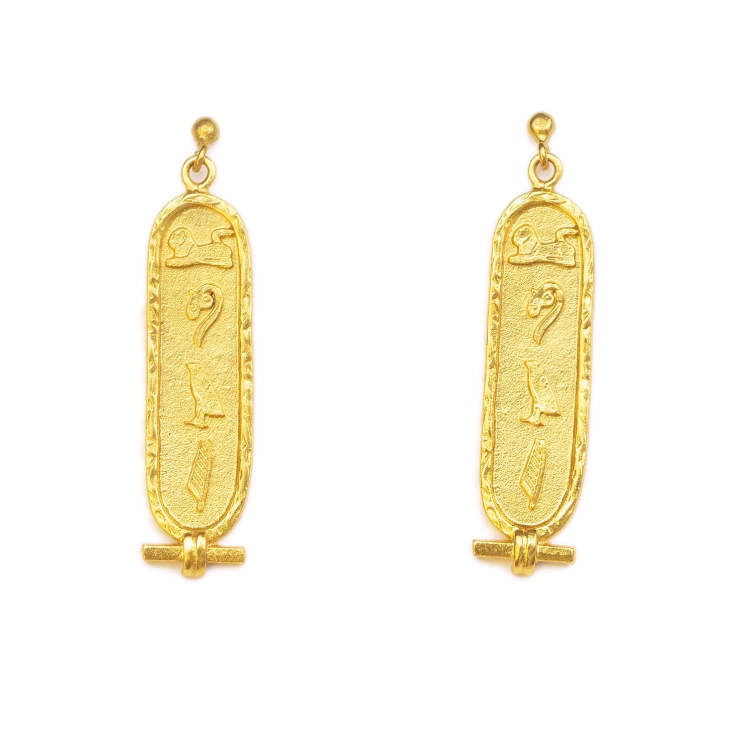 Featuring a drop design, these artisan earrings feature Egyptian hieroglyphs spelling out 'love.' These gold plated earrings would make a great style statement when teamed with Ottoman Hands' matching Gold 'Love' Cartouche Necklace.