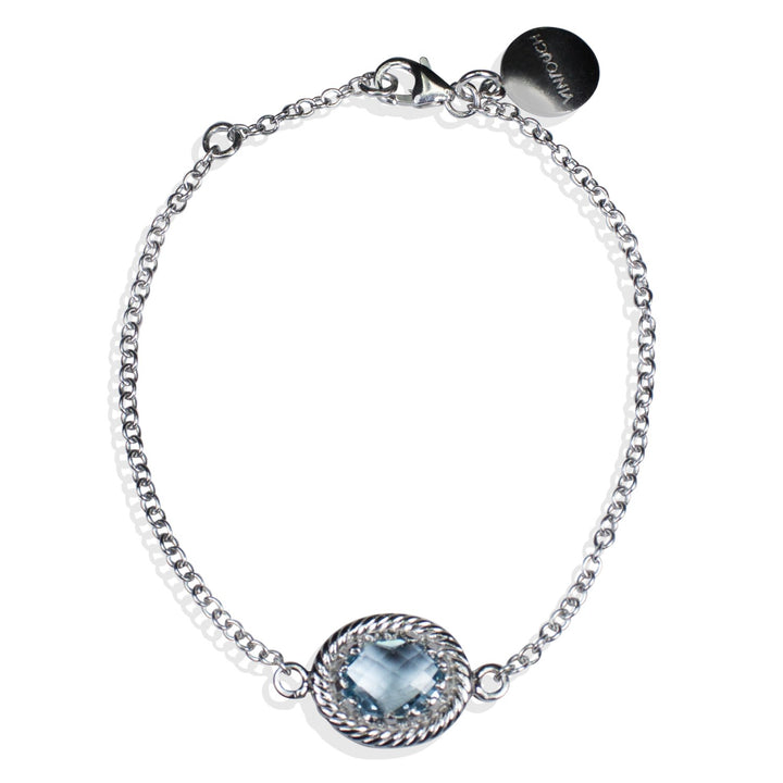 This Luccichio Sky Blue Topaz Bracelet by Vintouch Italy is a luminous ode to serenity and healing. At its heart rests a genuine cabochon sky blue topaz, framed by the refined simplicity of sterling silver and finished with a signature Vintouch charm. Handmade in Italy, the bracelet is imbued with artisanal quality and timeless elegance. Known for soothing and revitalizing energy, blue topaz adds depth of meaning to this glittering piece.