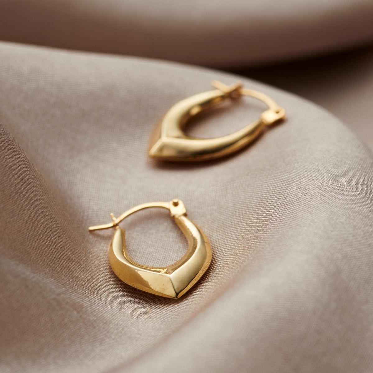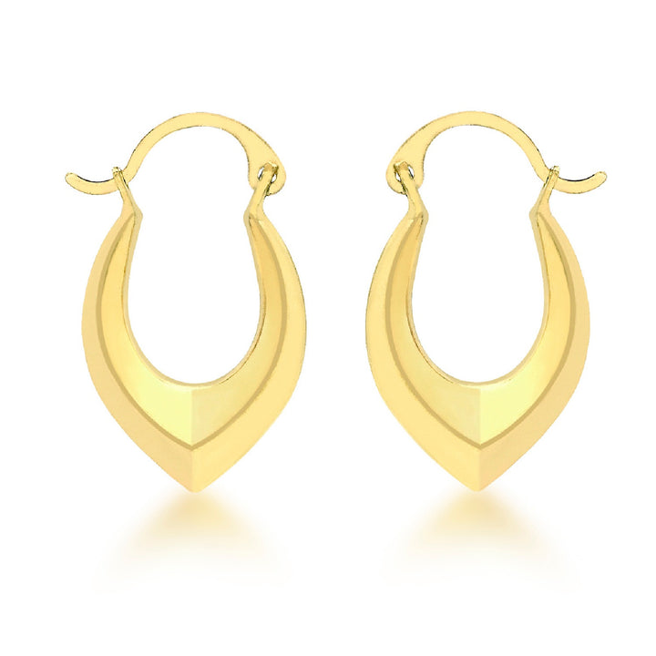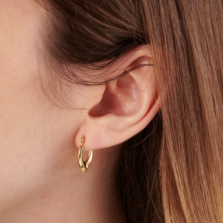 Each pair of these beautiful hoop earrings are made from pure 9ct Yellow Gold. Each hoop features an edged design coming down to a pointed drop. The edged design catches the light and makes these gold creole earrings shine. The perfect gift for yourself or that someone special in your life who deserves a little extra sparkle.