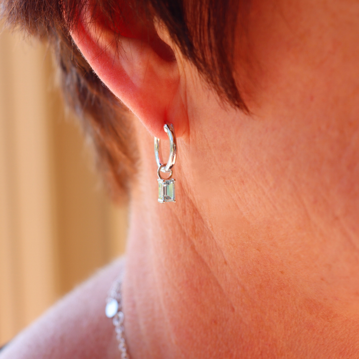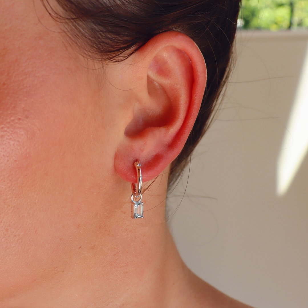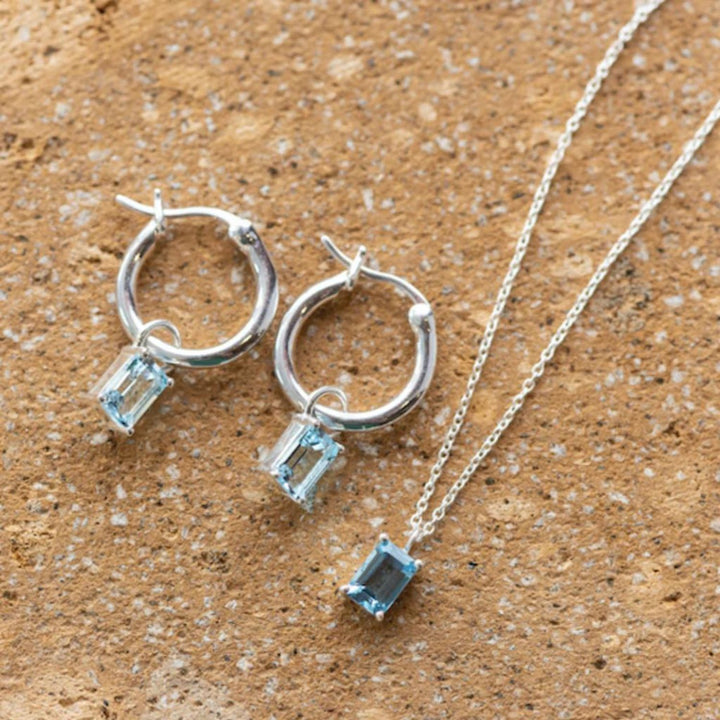 Beautiful, bright blue topaz. Featuring a rectangle cut of the blue topaz the semi-precious stone hangs from each of the small sterling silver hoop earrings. The calming blue colour within the blue topaz stone is all things classy and beautiful. The hoop is a 15mm sterling silver hoop.