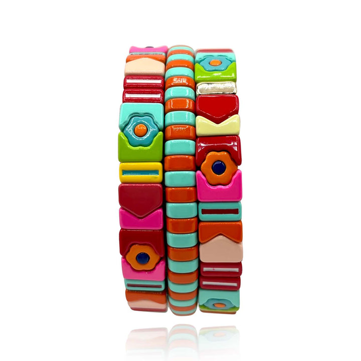 Multi-Color Floral And Stripe Enamel Three-Strand One-Size Elasticized Bracelets