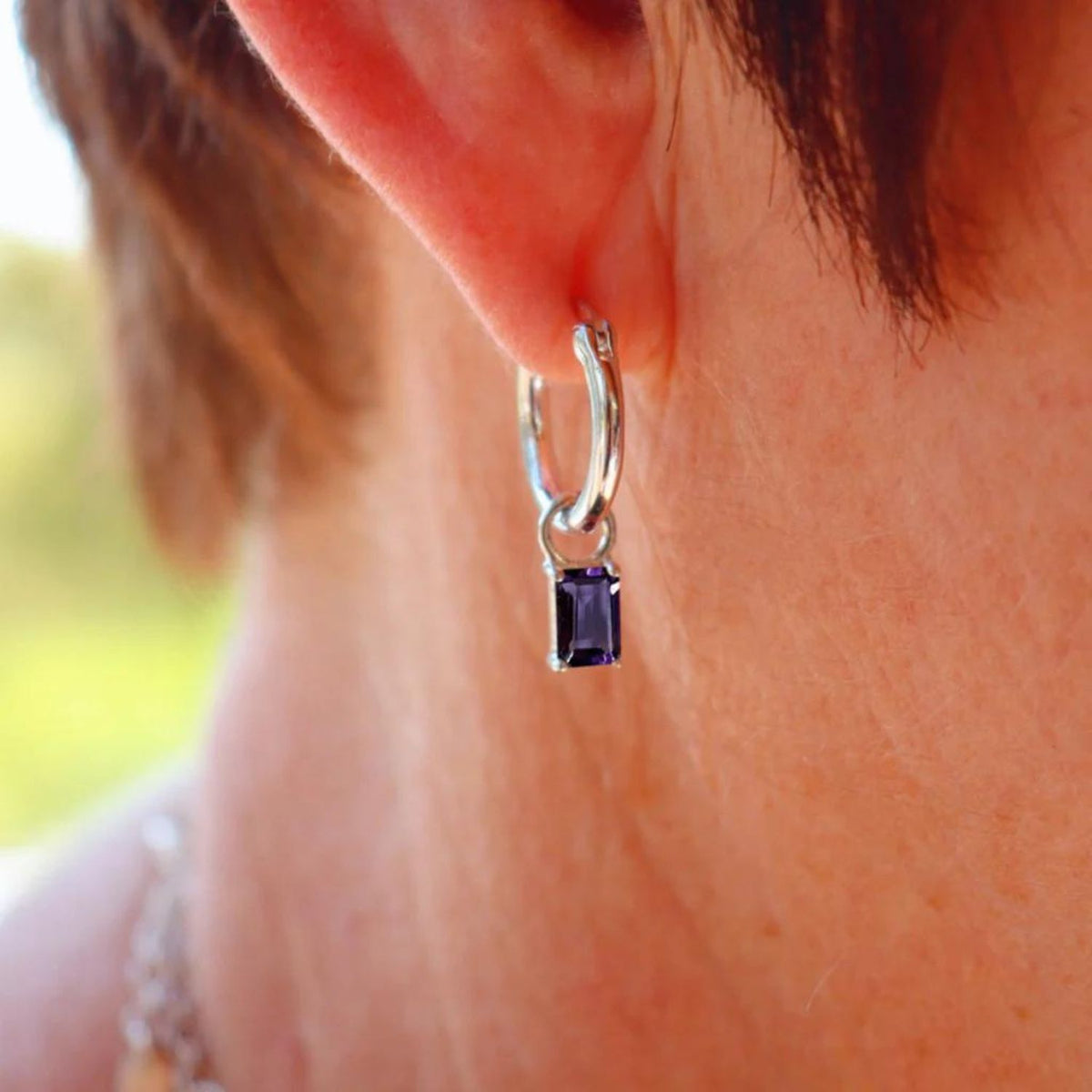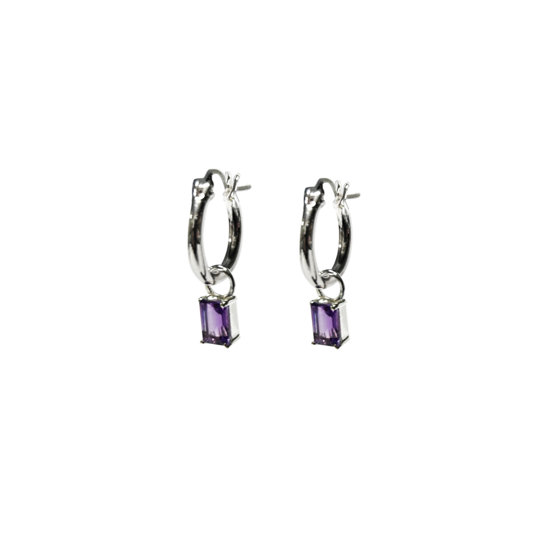 Perfect purple amethyst. Featuring a rectangle cut of purple amethyst, the semi-precious stone hangs from each of the small sterling silver hoop earrings. We love how the purple amethyst stone reflects an array of warm purple tones in different lights. Add these fine earrings into your jewellery rotation. The hoop earring is a 15mm sterling silver hoop, so it is a small style hoop. Purple Amethyst is the birthstone for February but is well loved year round!