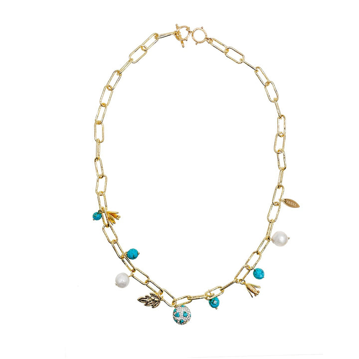 This necklace is handcrafted from a gold-plated chain. It is adorned with turquoise stones and freshwater pearls.