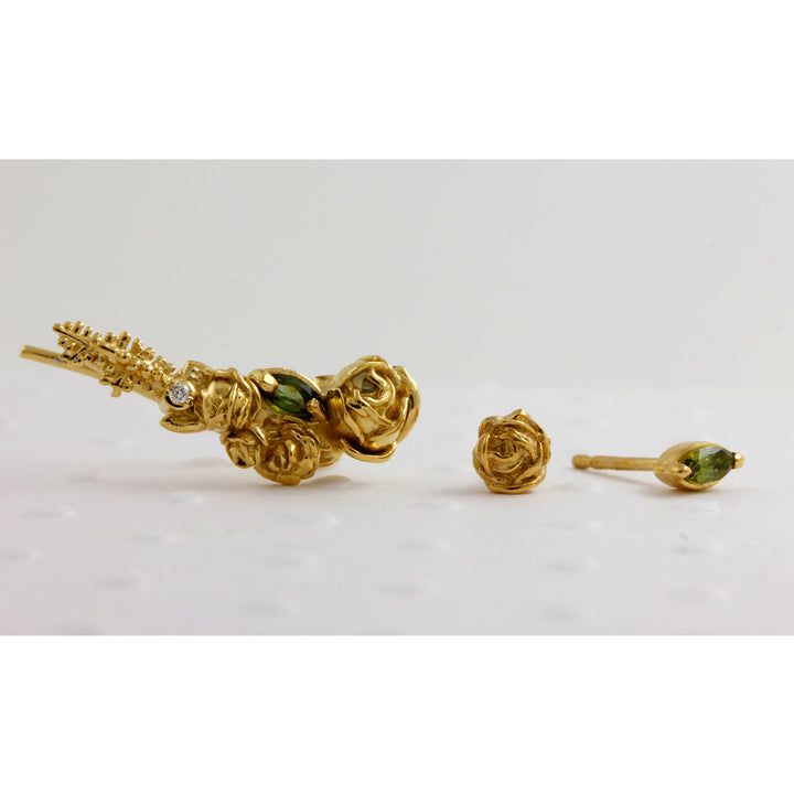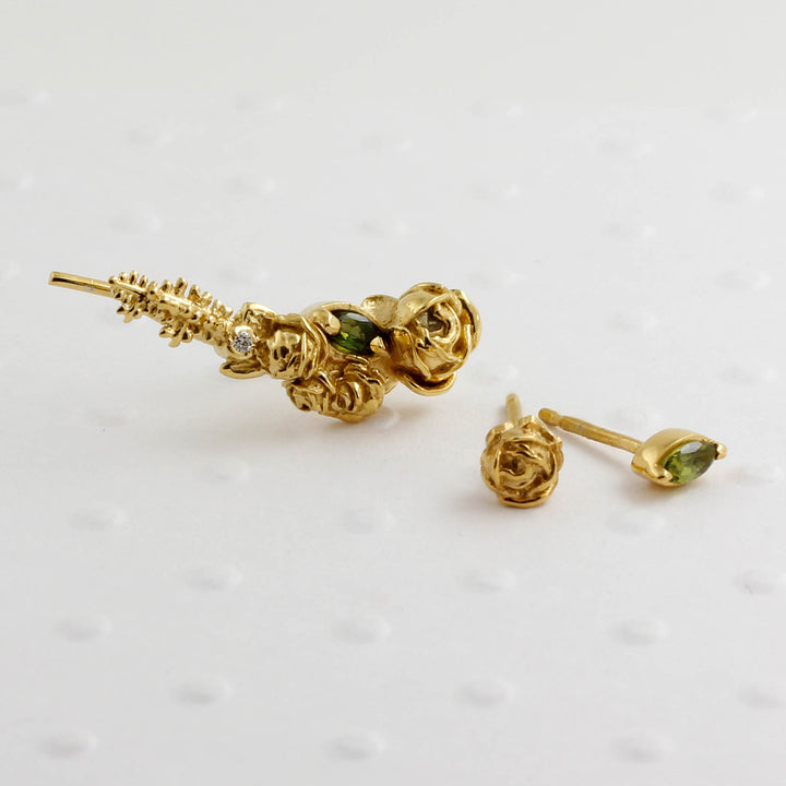 This elegant Rose slider earring features 4 tiny roses, leaves and foliage that delicately climbs up your ear, set with a marquis cut green tourmaline and a round brilliant cut diamond for extra sparkle – dainty, pretty and perfect for any occasion– can be worn as a pair or matched with our tiny rose studs or our tourmaline studs for an on-trend, asymmetric look.