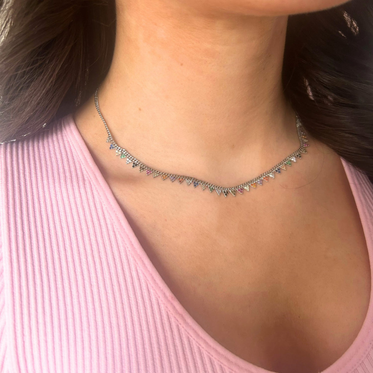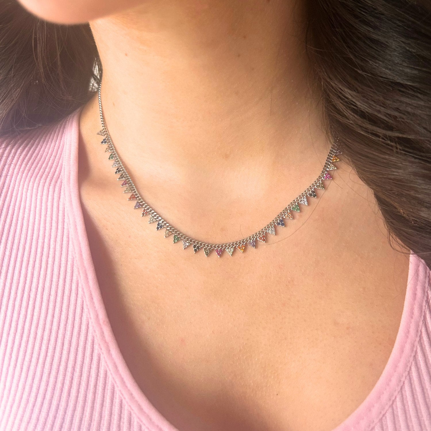 This station necklace is made from 100% sterling silver with a rainbow-jeweled triangle design.