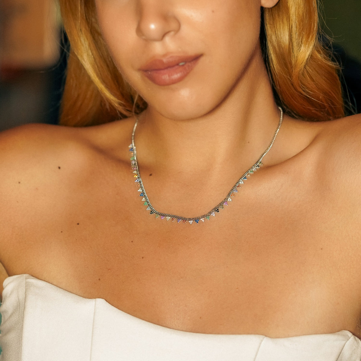 Colourful Rainbow Jewelled Triangle Sterling Silver Station Necklace