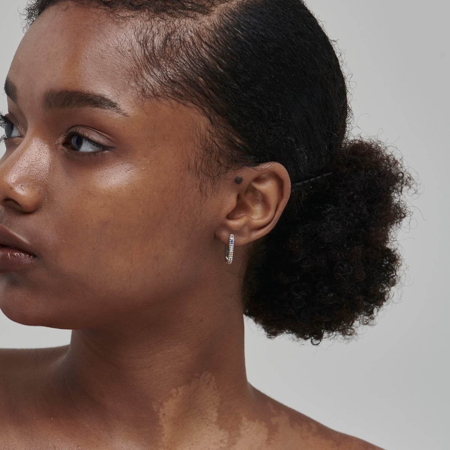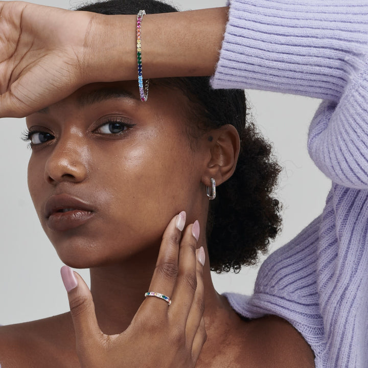 The Rainbow Mini Hoops Silver by Shabella Nyc are a trendy and playful accessory. The mini hoop size adds a touch of delicacy and versatility. The specific material is not listed, but the brand's commitment to quality is evident in their process, which eliminates nickel to prevent skin irritations. They also apply three times more coating than the normal amount to prevent tarnishing.