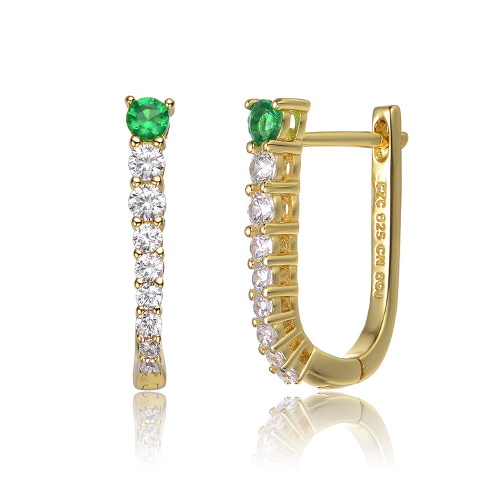 Vibrant emerald-like and sparkling -like cubic zirconias adorn these u-shaped huggie hoops, glistening in shared prong settings on the front. Hinged posts secure these elegant little hoops crafted from 14k yellow gold plated sterling silver. Wear them anytime and elevate your wardrobe. Available in different stone color options.