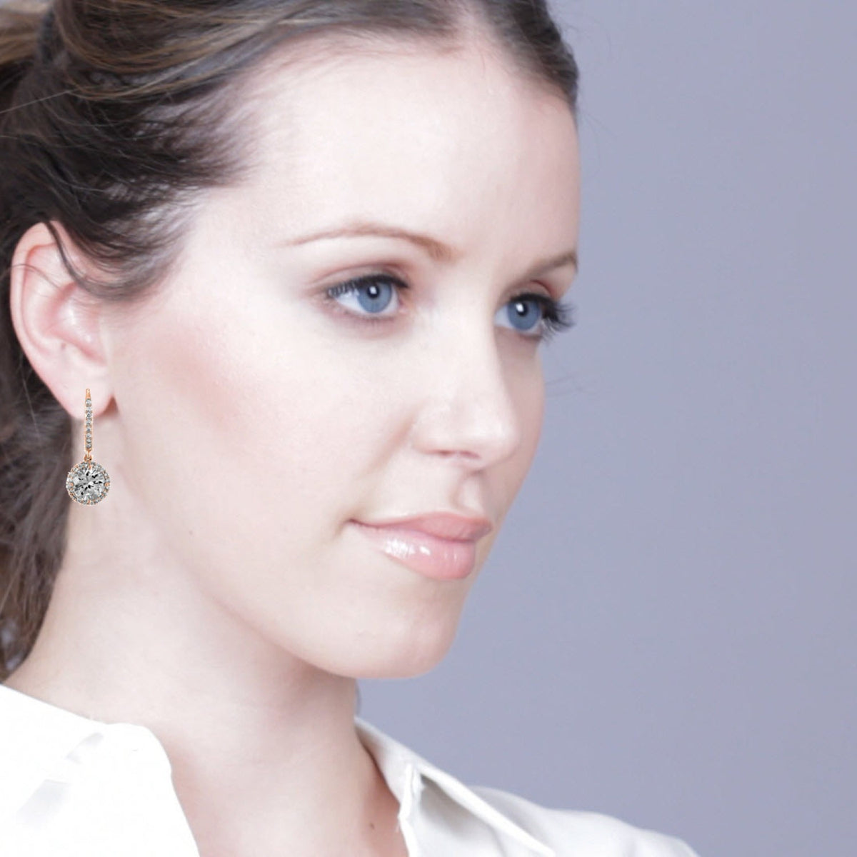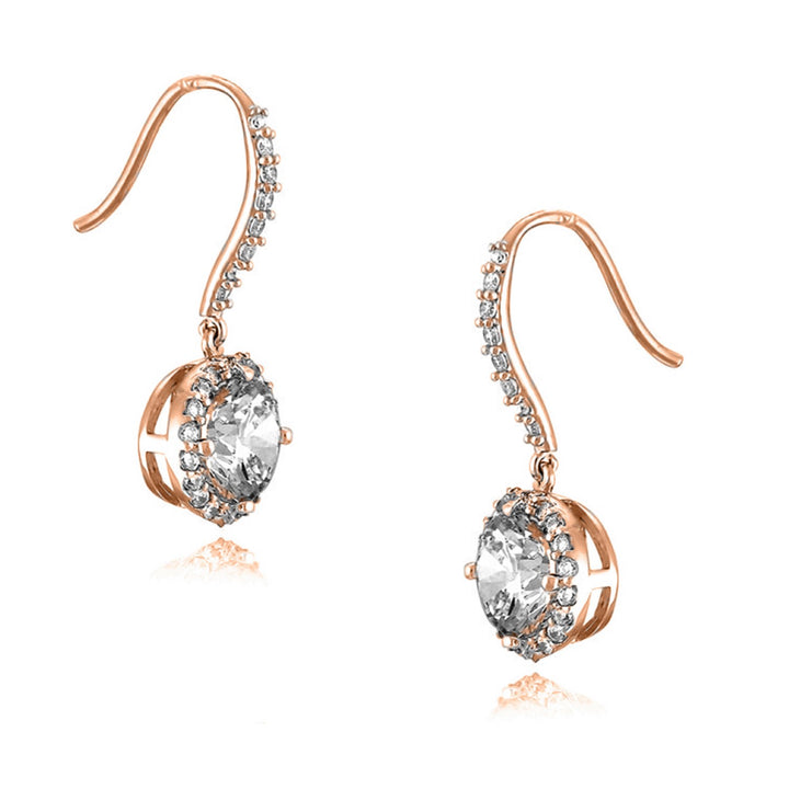 Looking for a pair of earrings that make a stunning statement? When your day requires a sparkling touch, you turn to this pair of Sterling Silver Dangling Simulated Earrings to ramp up your already fabulous little black dress. Each of these earrings features clear round Cubic Zirconia center stone with a dazzling halo of smaller clear round Cubic Zirconia's. These earrings secure with a hook available in 18K Rose Gold Plating. Item Should not come in contact with water.