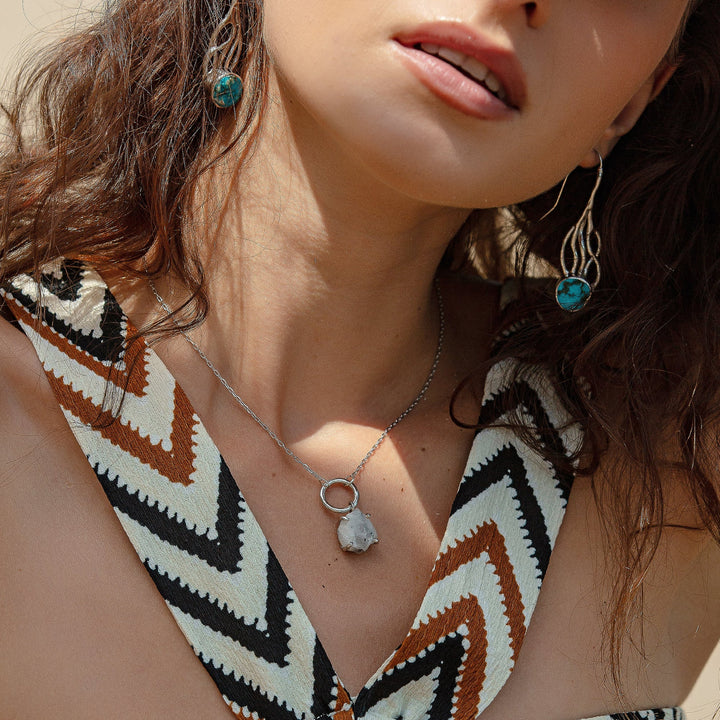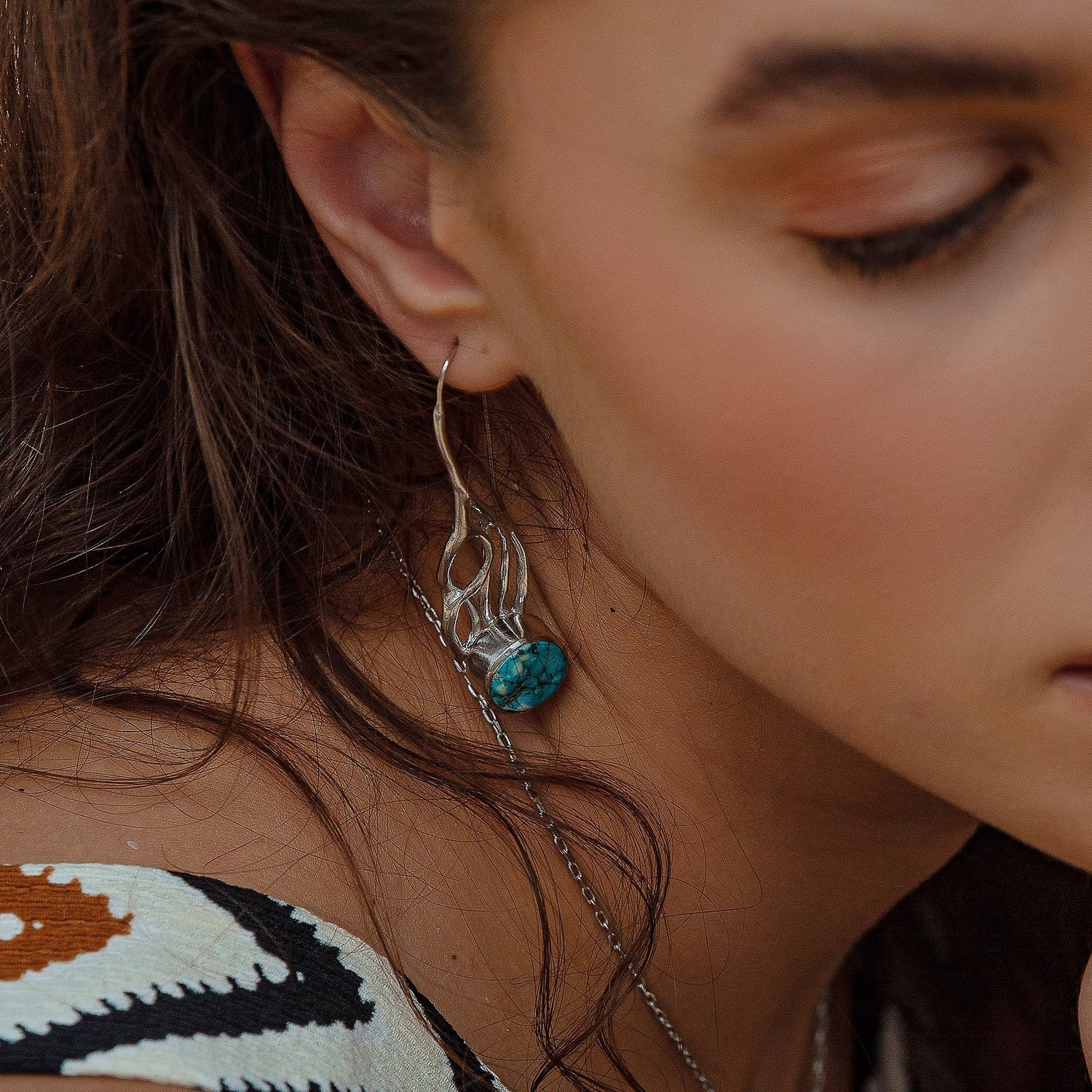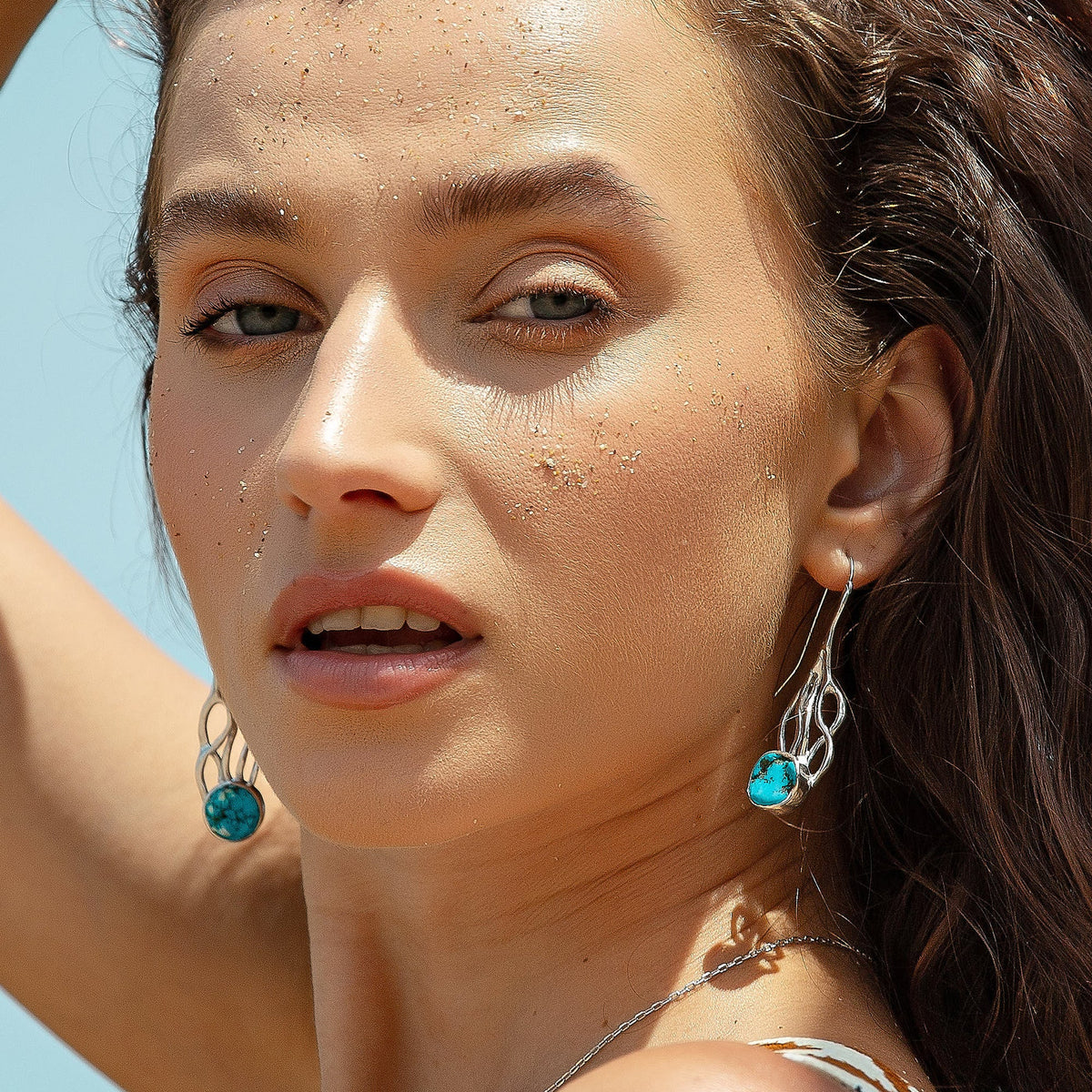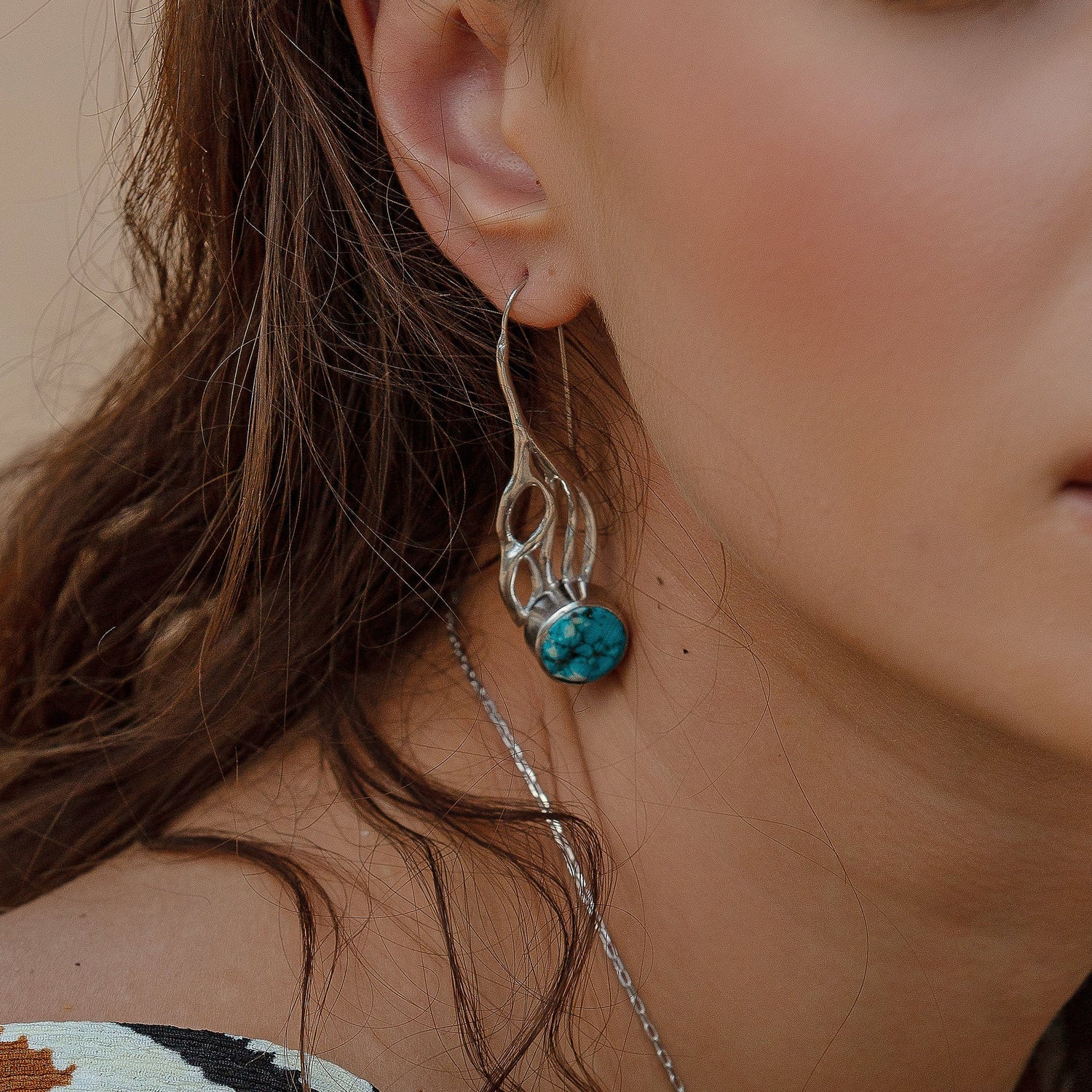 These drop earrings are individually crafted with genuine turquoise gemstones and silver grains. They should be taken off when washing hands or using skincare products and stored in the provided box.