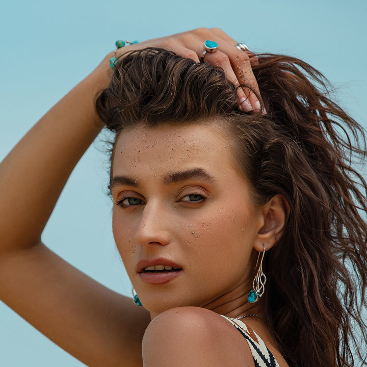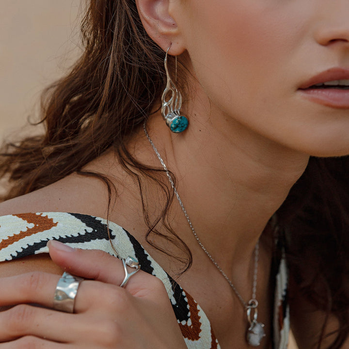 These Turquoise Silver Grain Wavy Drop Earrings by Mejoma will add a touch of elegance to any outfit. Individually crafted with genuine turquoise and silver grains, these earrings are sure to catch the eye and become a staple in your jewelry collection. The natural irregularity of each turquoise gemstone is a unique feature to be celebrated.