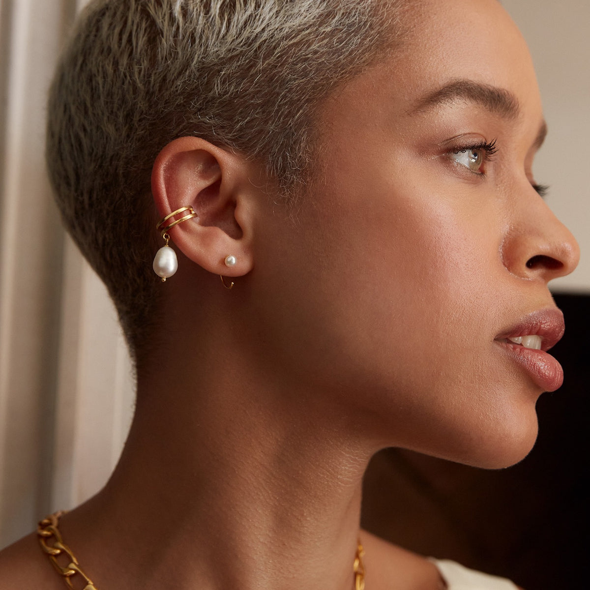 These chic pearl earrings are designed to make your styling easy with its lightweight feel and pull through design without using any backs. Created with 21ct gold plated brass, these through earrings are perfect for adding everyday chic to your ear stack.