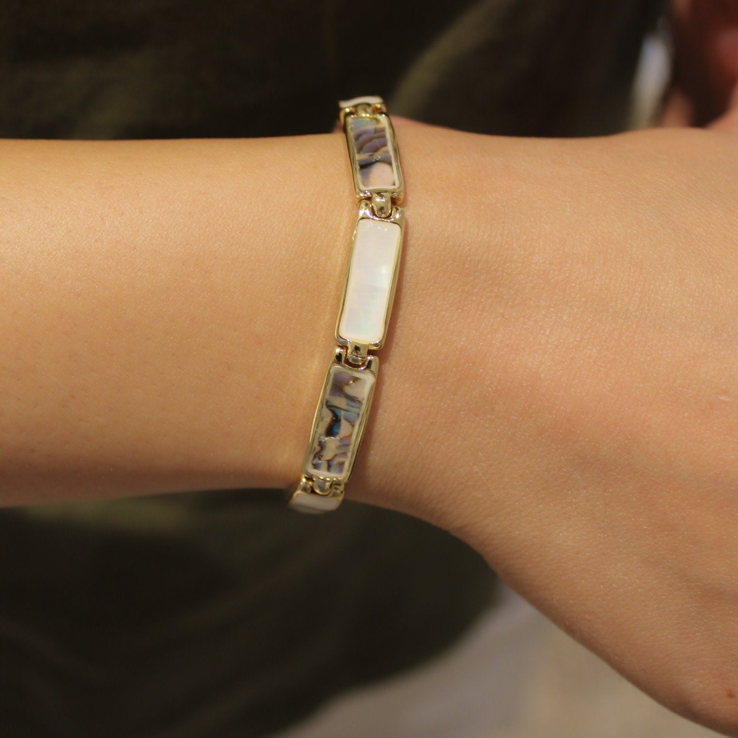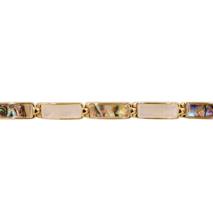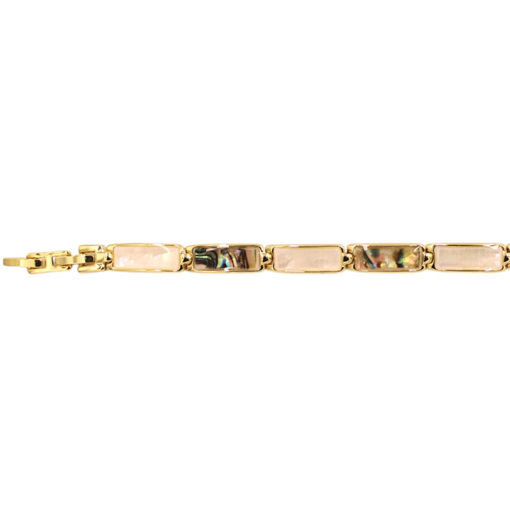 This bracelet is made from an unspecified metal with rhodium plating and features mother-of-pearl and multicolored details. It is hypoallergenic, waterproof, and anti-tarnish.