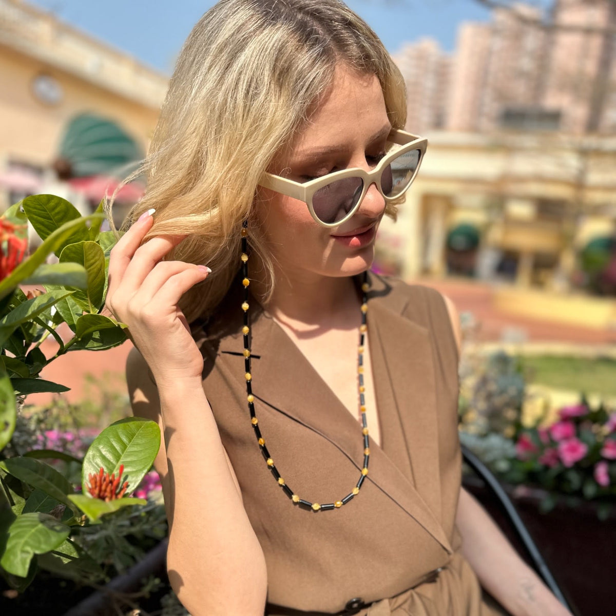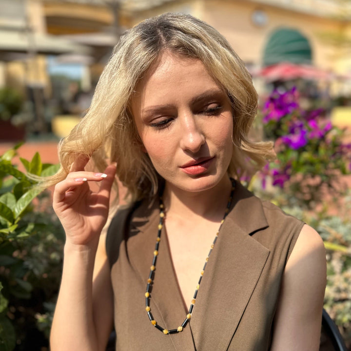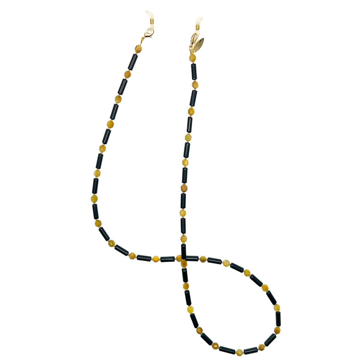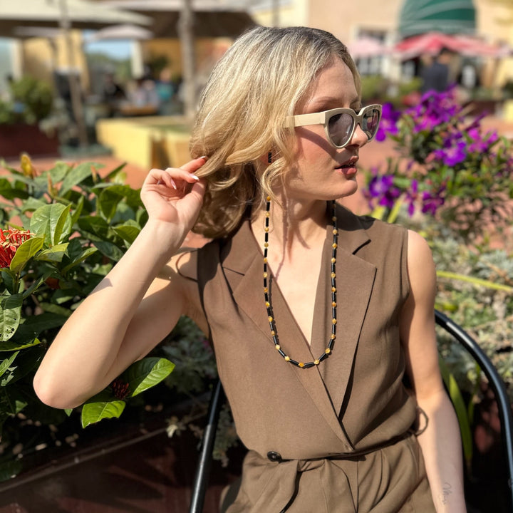 This Colorful Gemstone Multi-Way Glasses Chain by Farra is a unique and versatile accessory that seamlessly blends functionality with luxurious style. Combining the deep, protective energy of obsidian with the vibrant, golden hues of tiger eye stones, this piece is a striking statement of natural beauty. Its multi-way design allows it to be worn as a practical glasses chain or as an elegant necklace, making it a perfect addition for those who appreciate accessories that are both beautiful and adaptable.