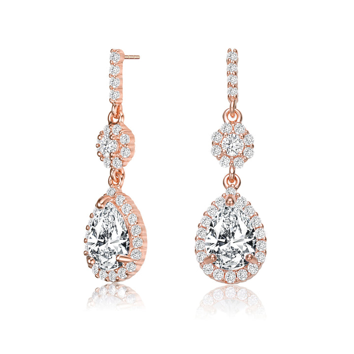Sterling Silver With Rose Gold Plated Clear Pear With Round Cubic Zirconia Halo Cluster Accent Drop Earrings