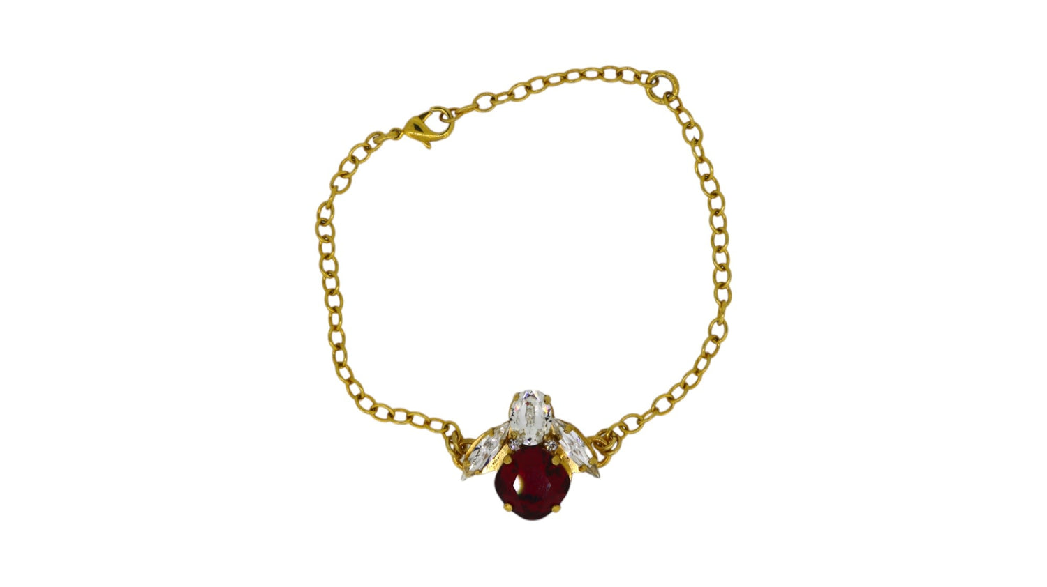 This Red Bee Bracelet in Gold by Vickisarge is a daring yet elegant signature piece. Featuring a vivid red cushion-cut crystal at its center, it glows against radiant 23k gold plating. Handcrafted in the brand’s Kensington workshop, this bracelet is a bold staple that transitions seamlessly from day to evening, embodying the brand’s fearless and iconic aesthetic.