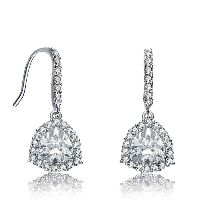 These White Gold Plated fish hook dangle earrings involve a large drop cubic zirconia solitaire enveloped by a halo of smaller cubic zirconia stones. Capture all the attention at the next bash. Item Should not come in contact with water.