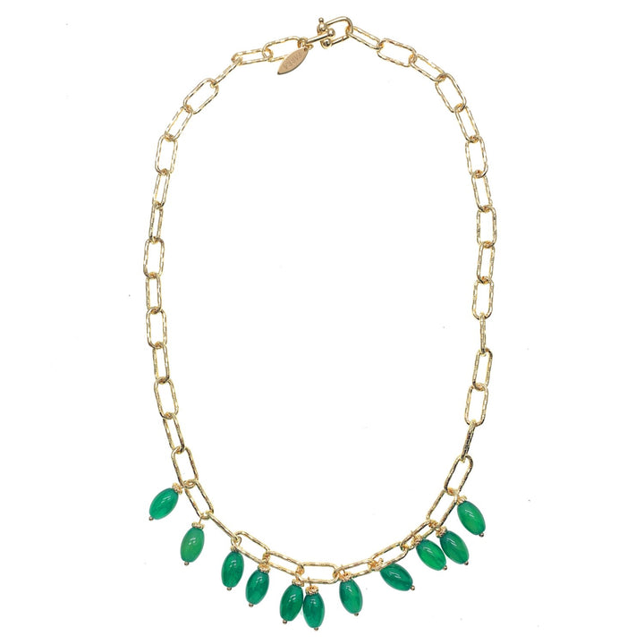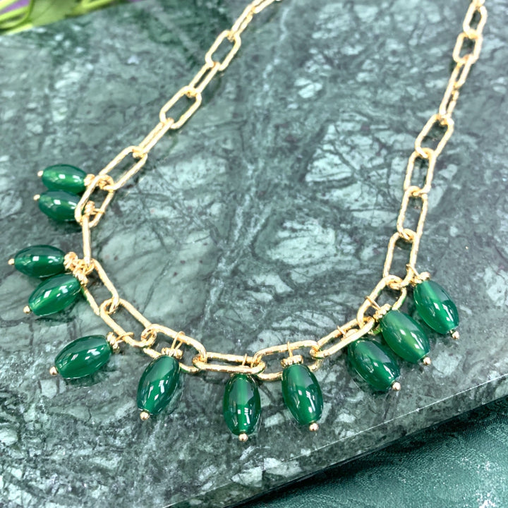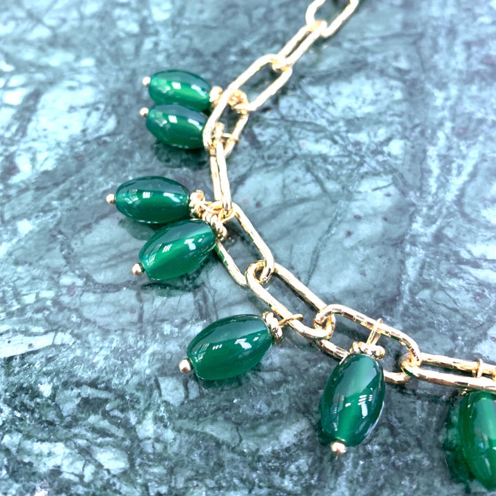 This statement necklace is crafted with a 14k gold-plated chain and features green agate stones.