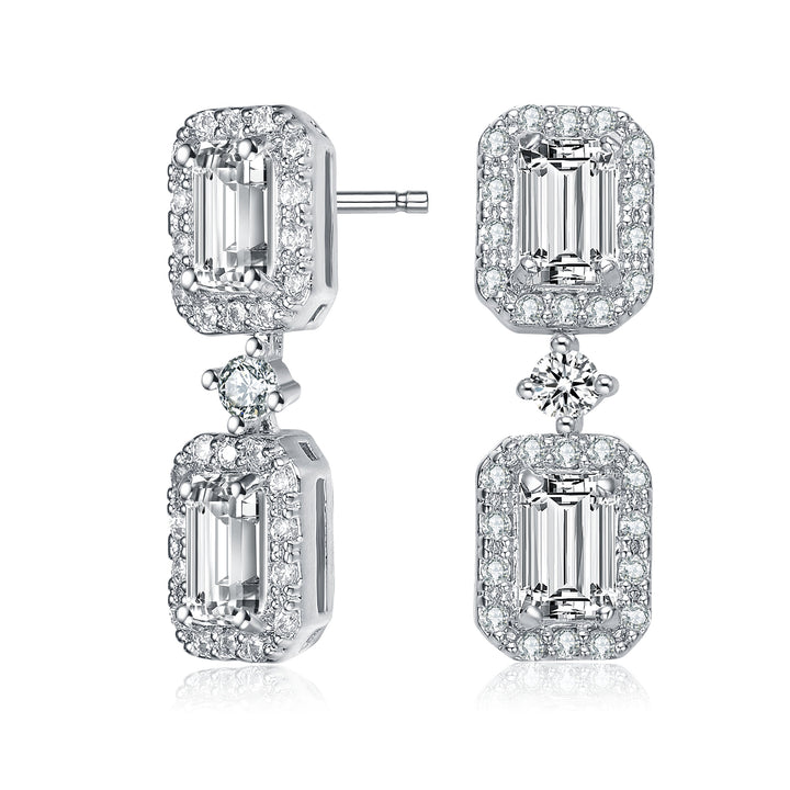 A simple earrings with an antique and dazzling allure will surely capture anyone's attention. These feature brilliant emerald cubic zirconia haloed with clear round cubic zirconia in these tier style earrings. These earrings are set in .925 Sterling silver with rhodium plated and secures with butterfly clasp.